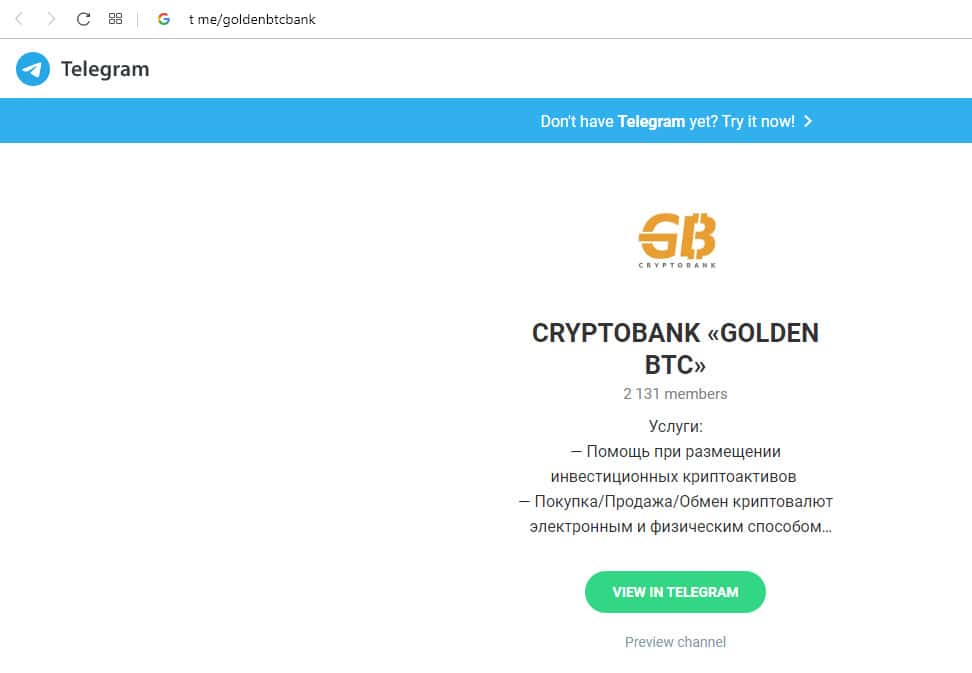 На данный момент, у мошенников появилась возможность вести эффективную деятельность в социальных сетях и в этом помогает условно анонимная площадка Телеграм. Аферисты 1BTCBroker создали там канал и уже успели собрать свыше 2000 членов сообщества. Вот ссылка, чтобы вы не попались туда случайно t me/goldenbtcbank