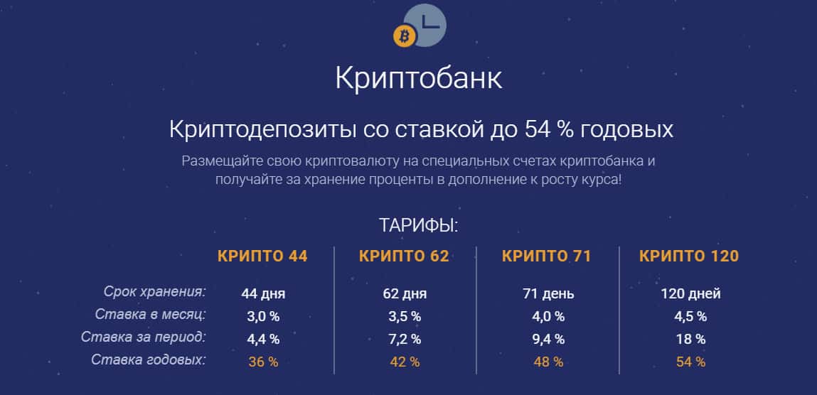 Мошенники 1BTCBroker также предлагают наивным лохам криптовалютные депозиты, при чем этот хайп среднего разряда из-за процентной ставки в 54% годовых. Дело в том, что данный крипто-хайп не протянет и года, поэтому лучше не стоит с ними связываться, тем более что риск падения цены на криптовалюту также присутствует.