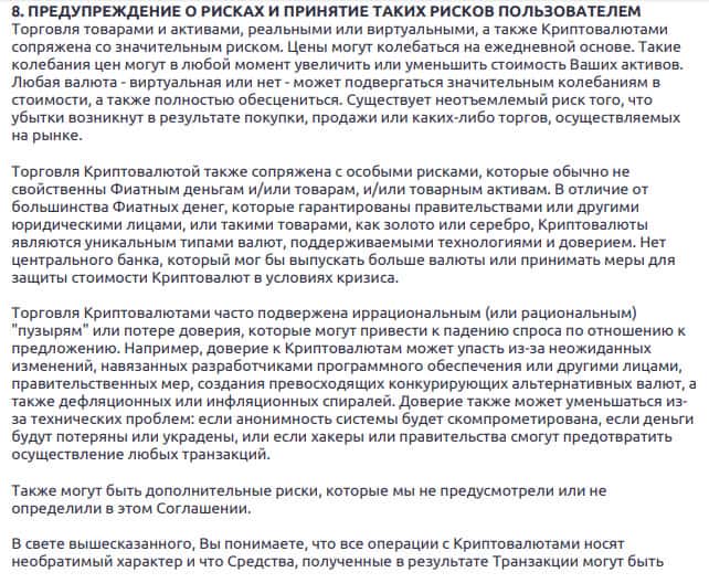 Также важно отметить раздел о рисках в договоре крипто-конторы 1BTCBroker. Там идет предупреждение о рисках и самое главное, есть такой подраздел, как дополнительные риски, которые они не предусмотрели или не определили в этом Соглашении. Ну а за все остальное они и так не собирались нести ответственность перед клиентами.