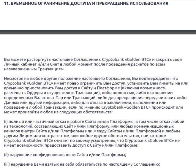 Не менее интересный раздел касательно временного ограничения доступа и прекращение использования клиентом личного кабинета. Аферисты 1BTCBroker пишут там, что клиент должен согласиться с тем, что они могут ограничить доступ к аккаунту, особенно когда там лежит какая-то сумма.