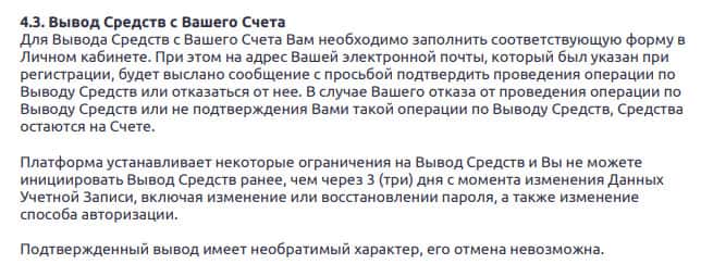 Касательно вывода средств в конторе 1 БТЦ Брокер, там также есть некоторая загвоздка в плане вывода средств. Она касается определенных задержек, а в некоторых случаях и вовсе подтвержденный вывод имеет необратимый характер и его отмена невозможна. С таким подходом к деньгам, лучше не вкладывать туда ничего.