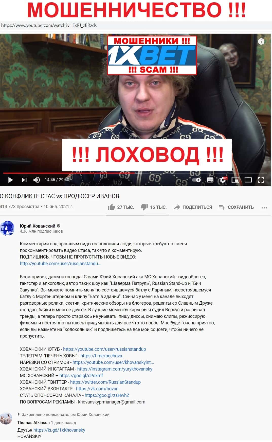 Ниже можно увидеть одного из лоховодов, который втягивал своих подписчиков в аферу 1xBet и 1 Икс Ставк.