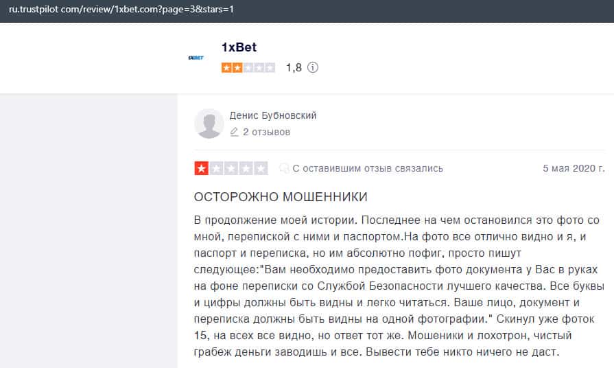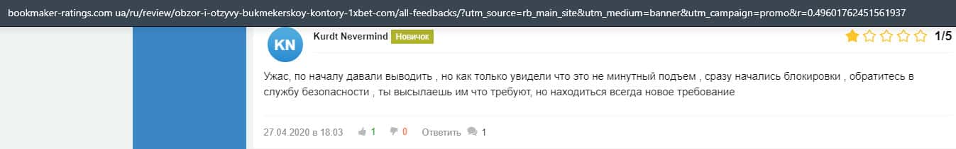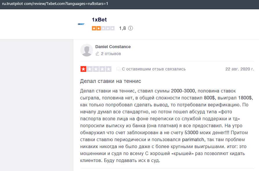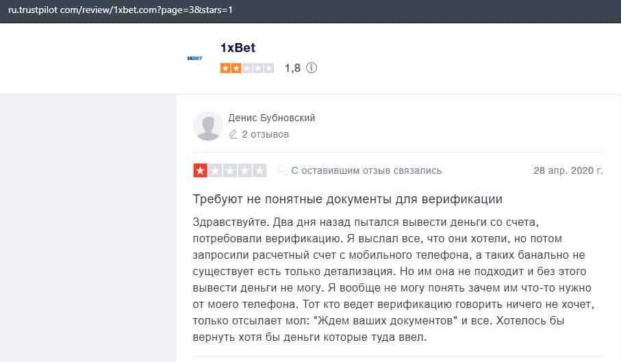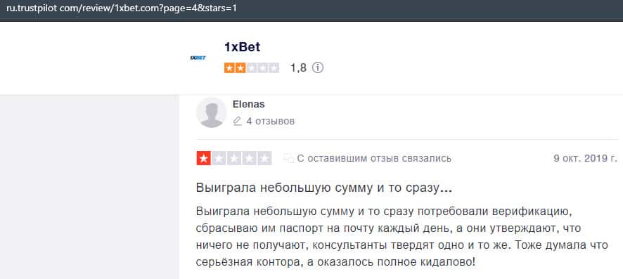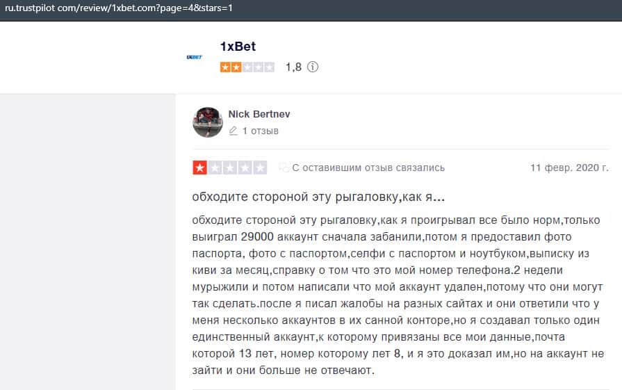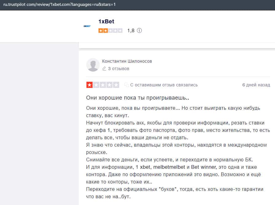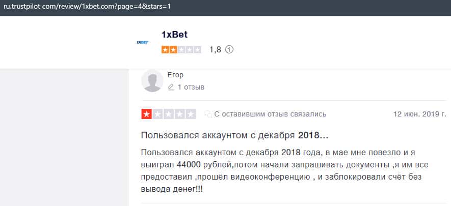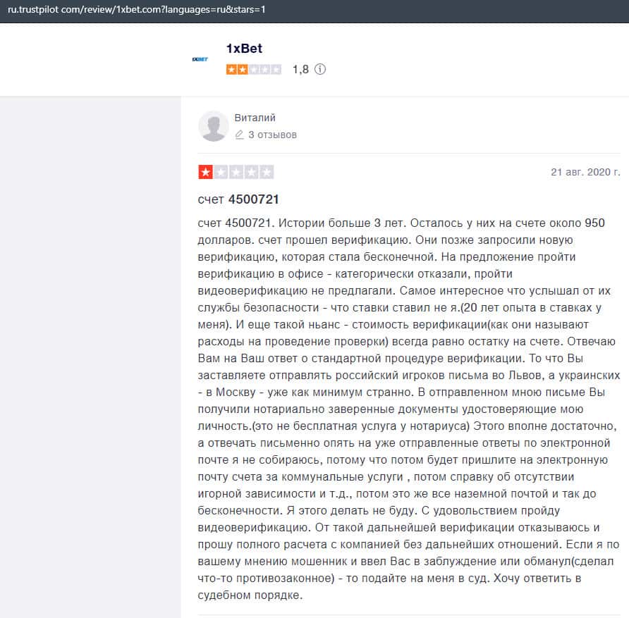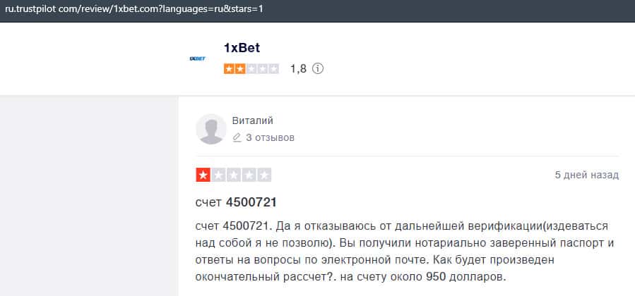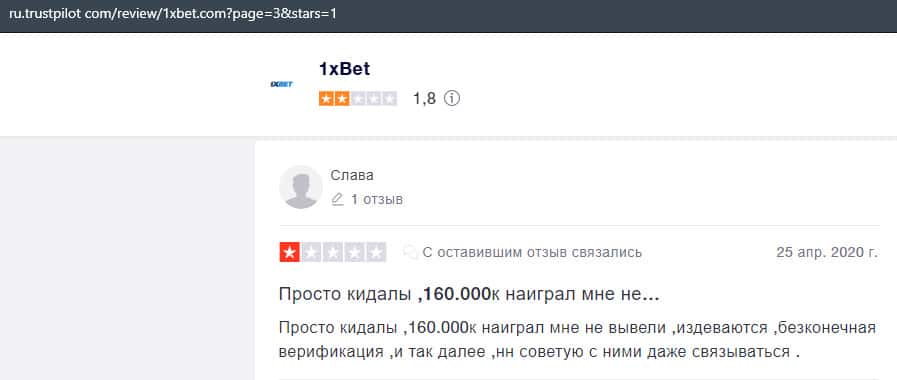 В данном отзыве рассказывается, как он выиграл в шараге 1xBet 1800 долларов, делая ставки, а назад вывести у него так и не получилось, так как потребовали верификацию.