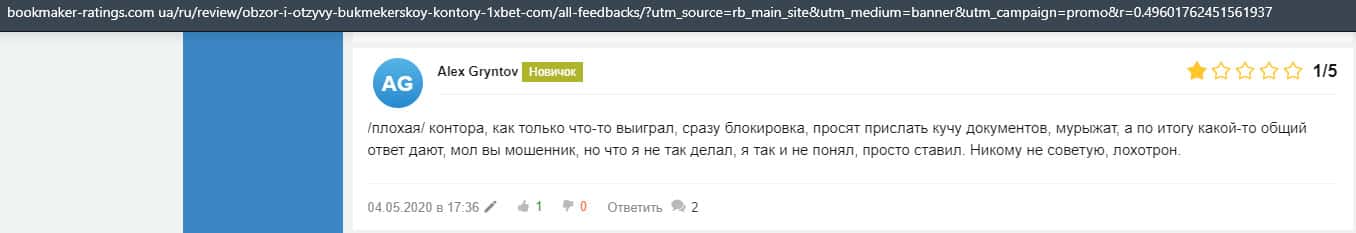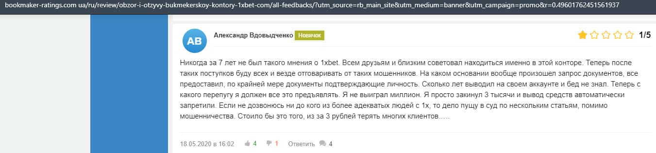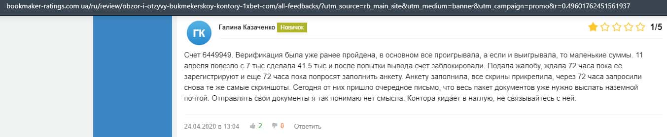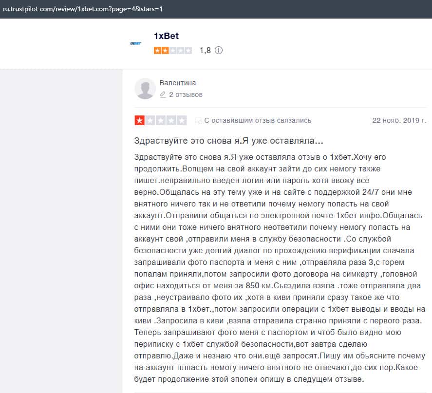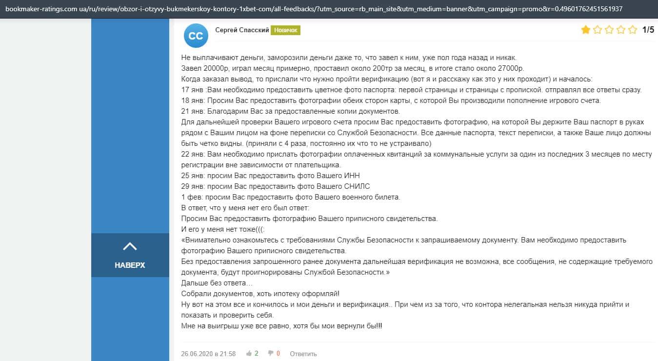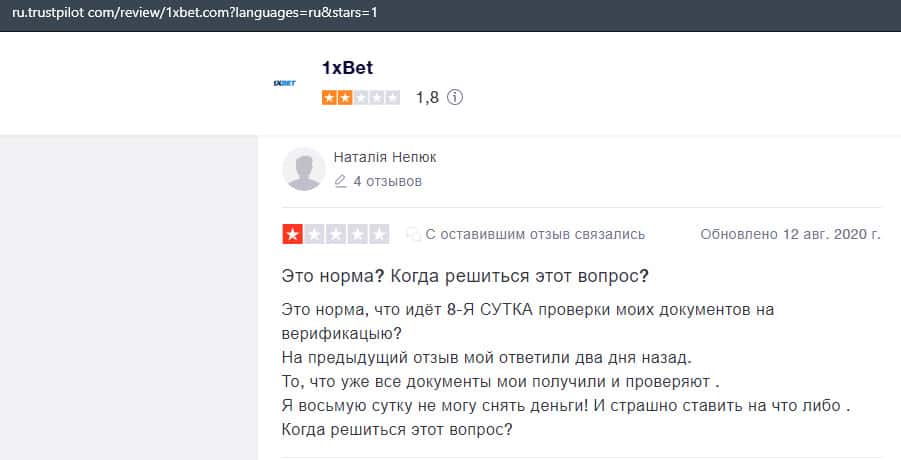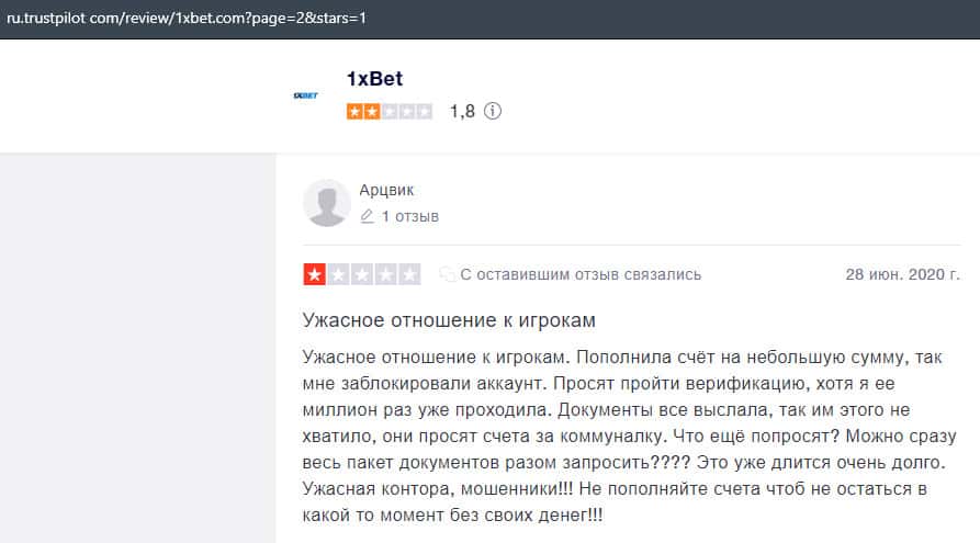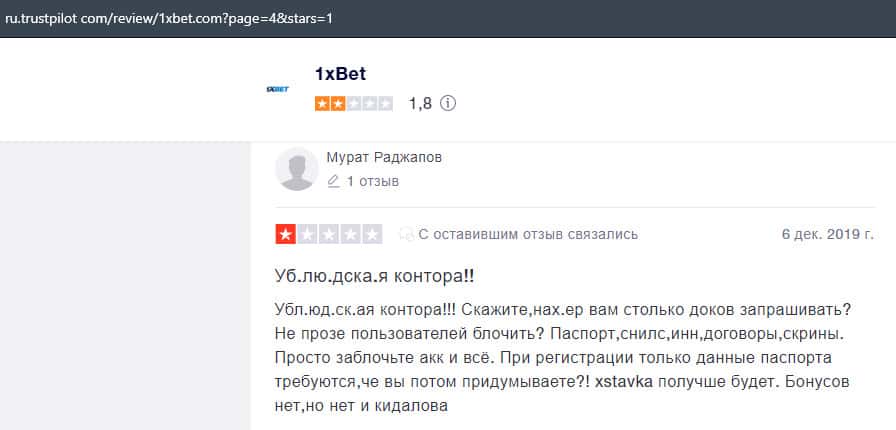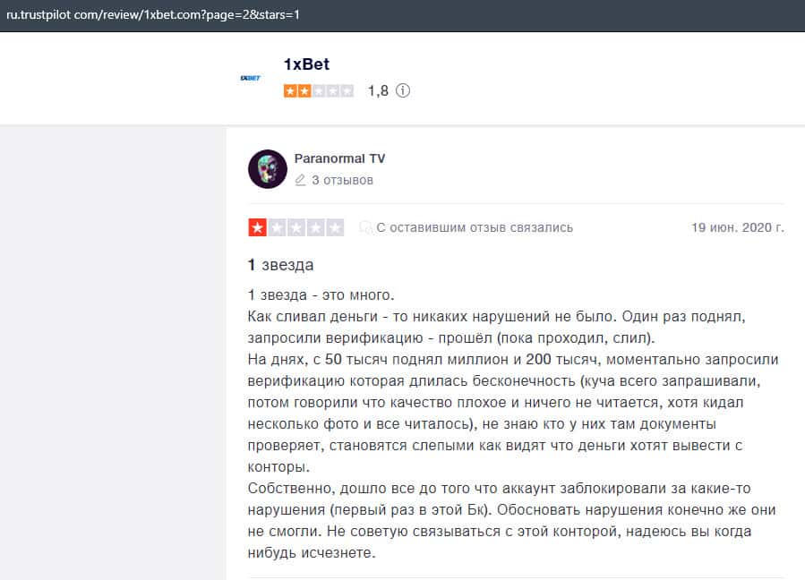 В данном отзыве рассказывается, как он выиграл в шараге 1xBet 1800 долларов, делая ставки, а назад вывести у него так и не получилось, так как потребовали верификацию.