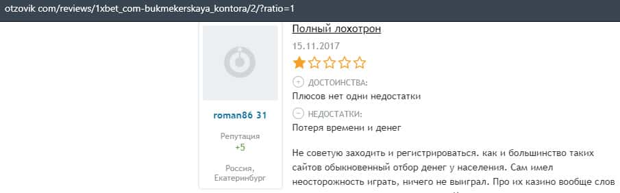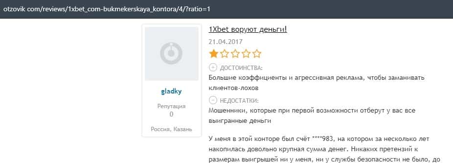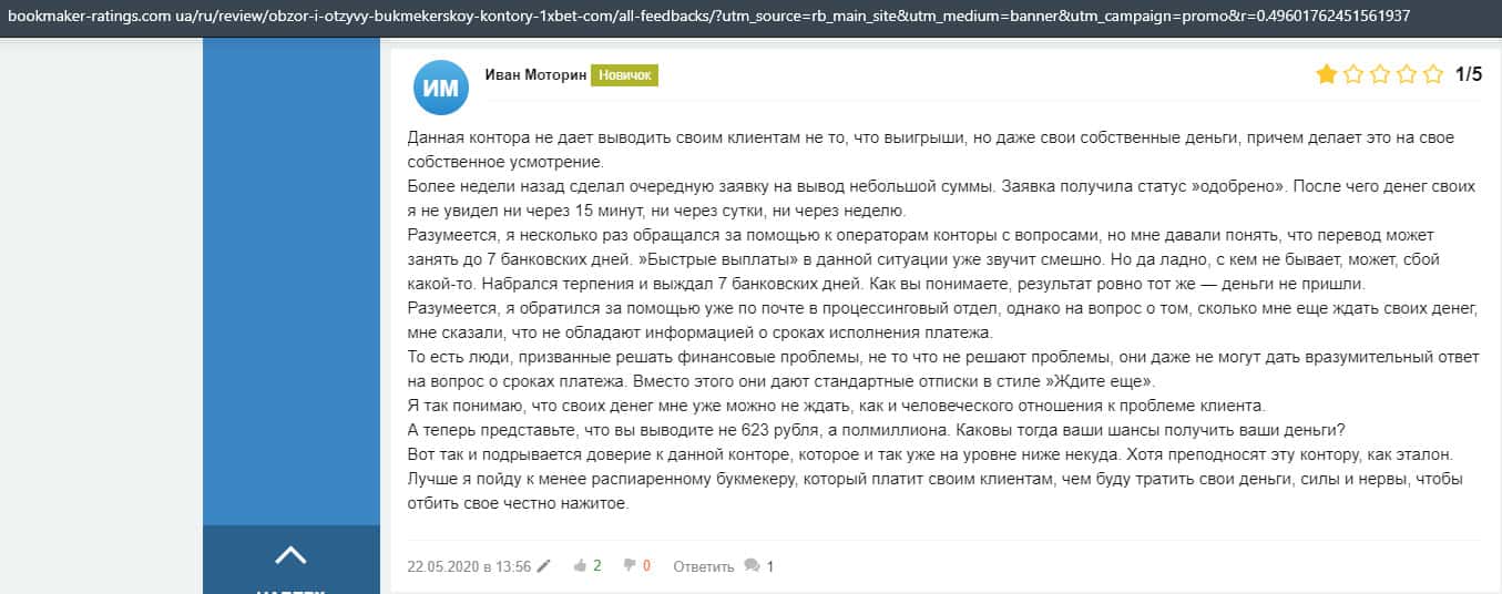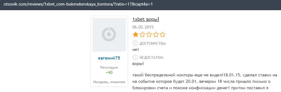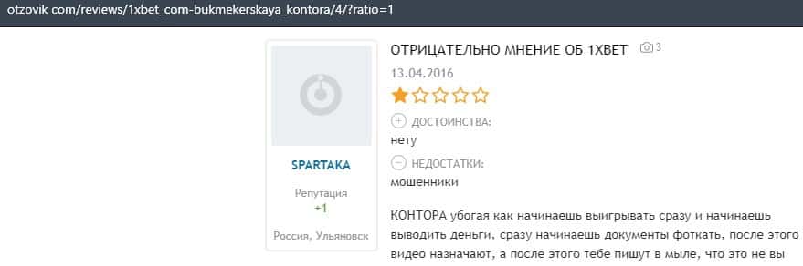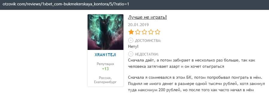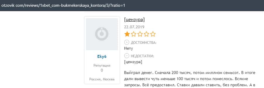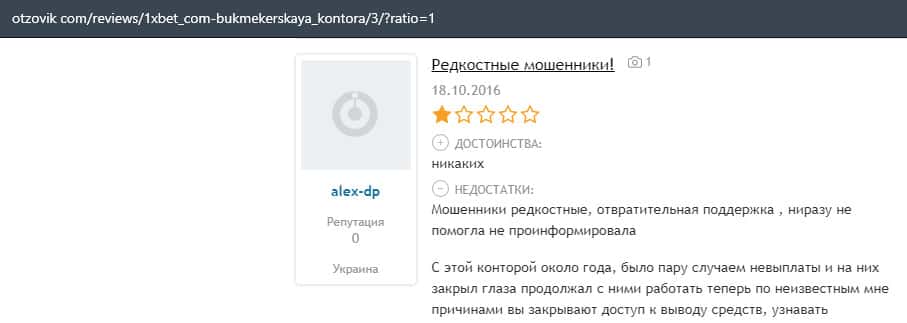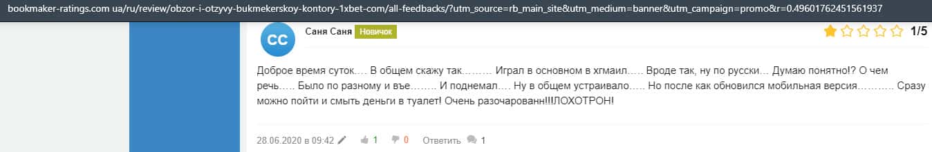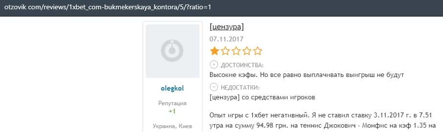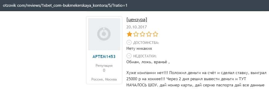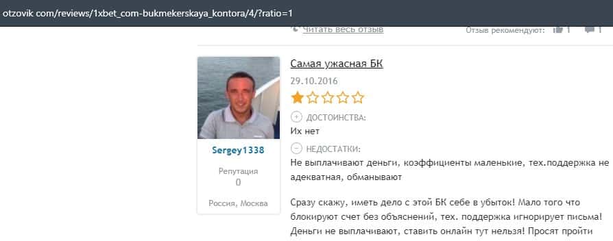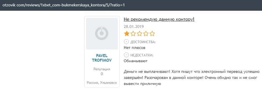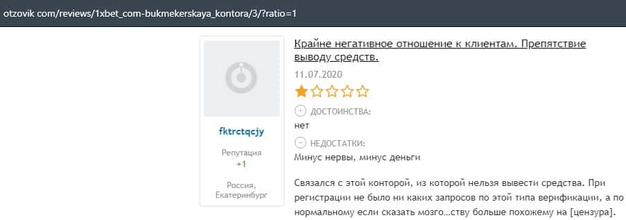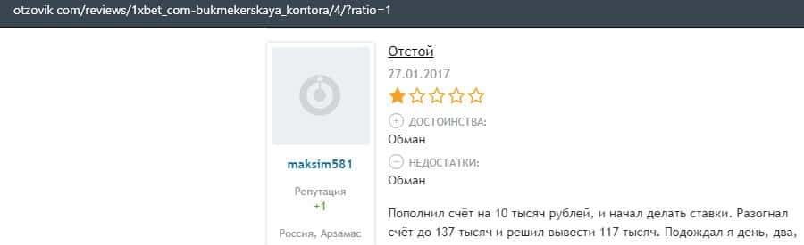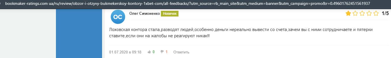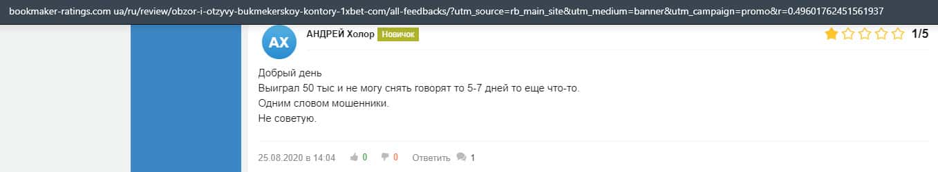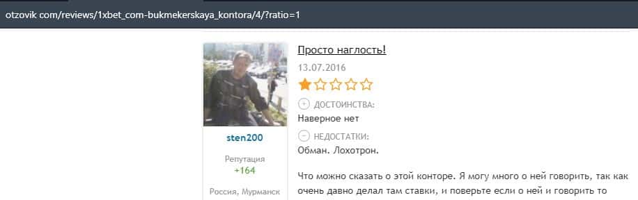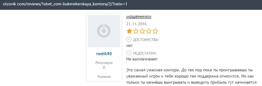 Еще один пользователь интернета высказался, что он имеет отрицательное мнение о букмекерском лохотроне 1xBet. Жулики попросту отказываются выводить деньги.