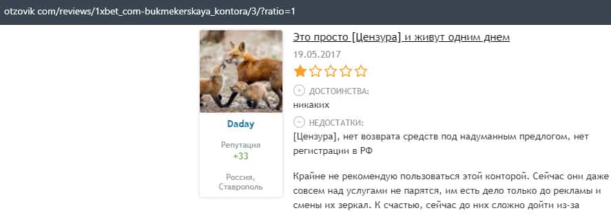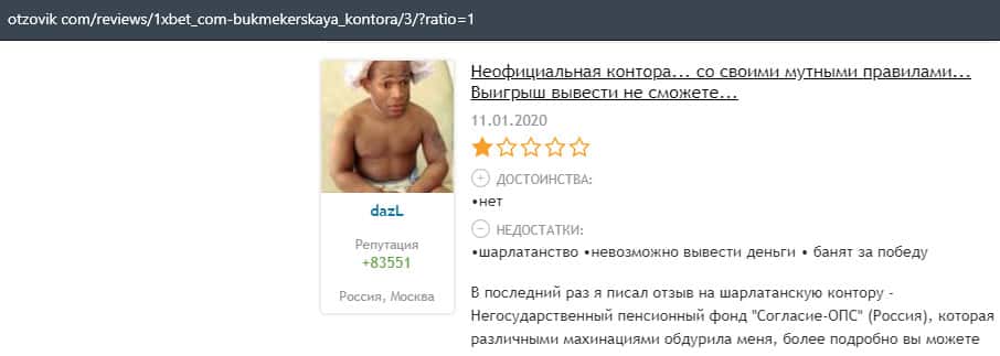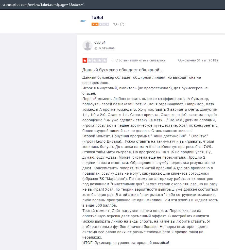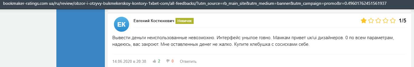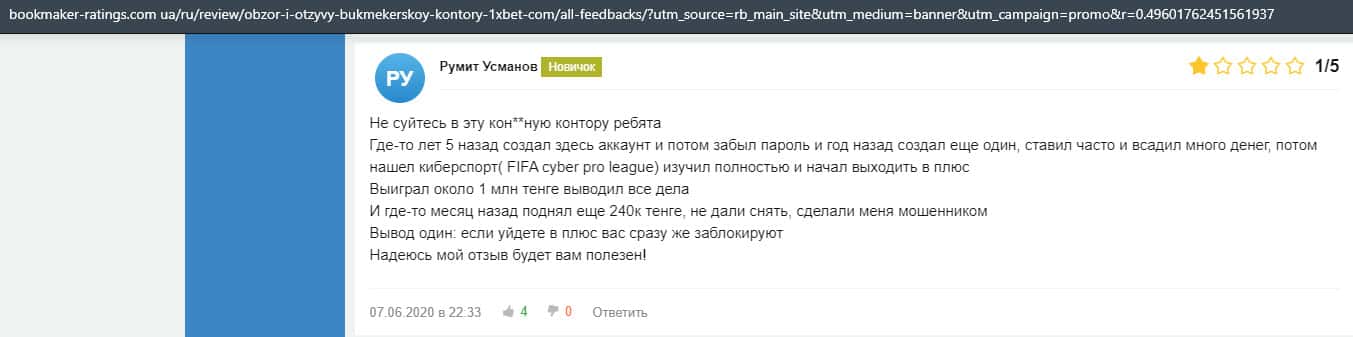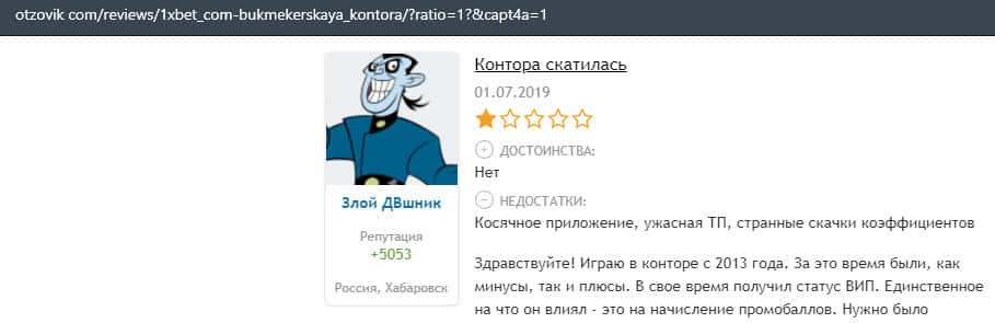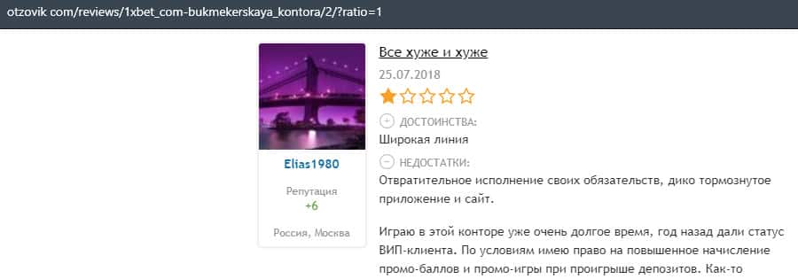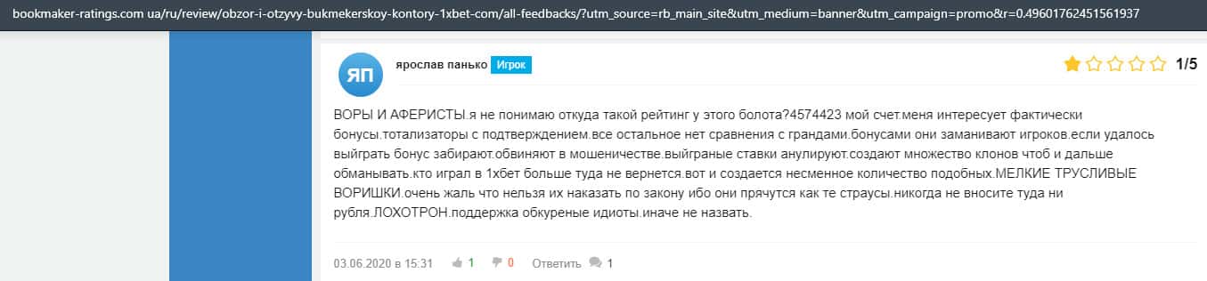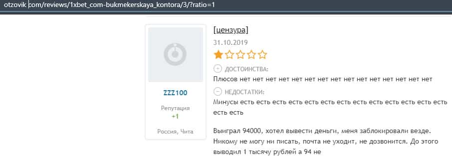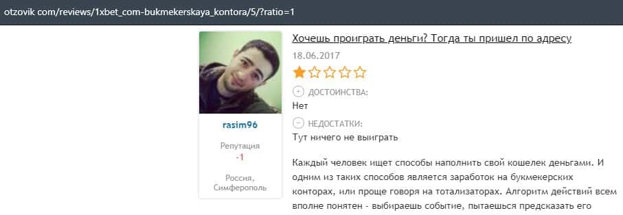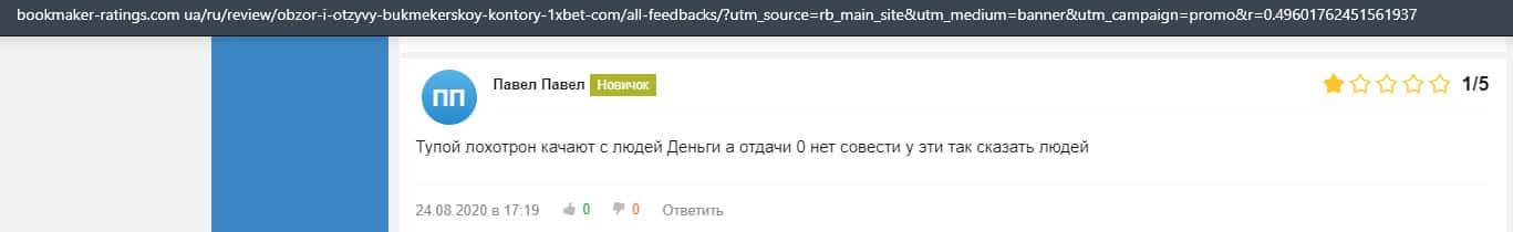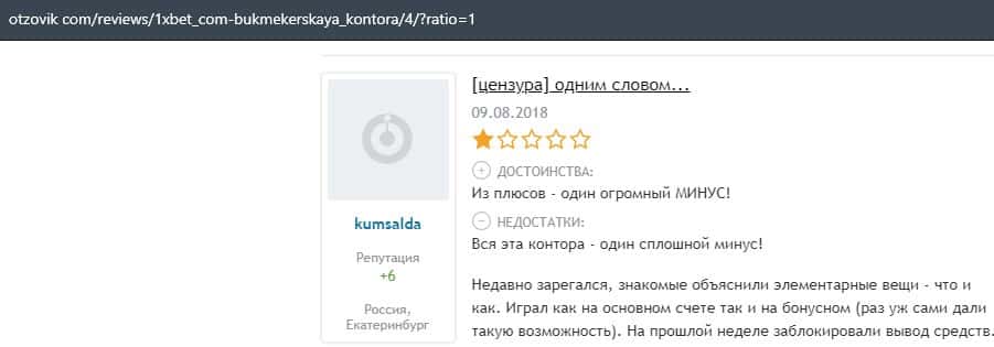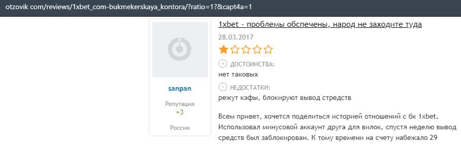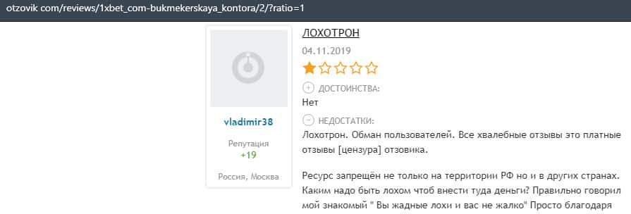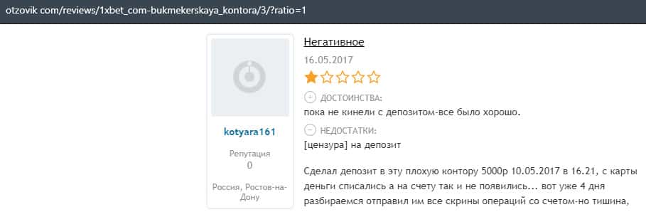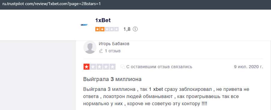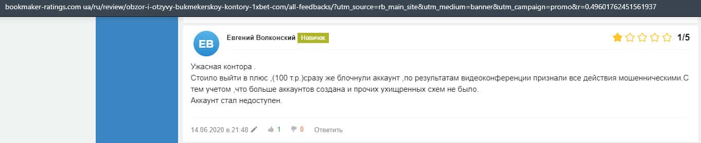 Еще один пользователь интернета высказался, что он имеет отрицательное мнение о букмекерском лохотроне 1xBet. Жулики попросту отказываются выводить деньги.