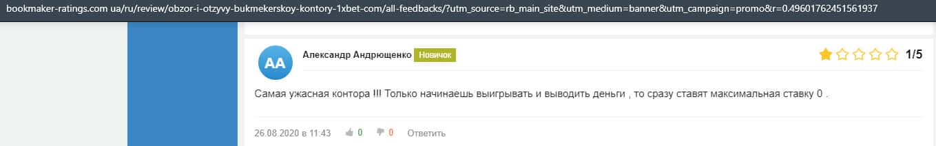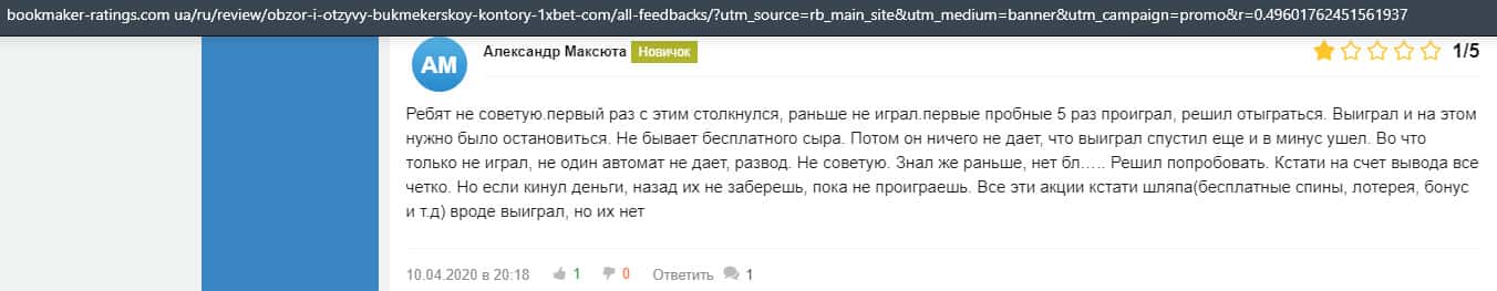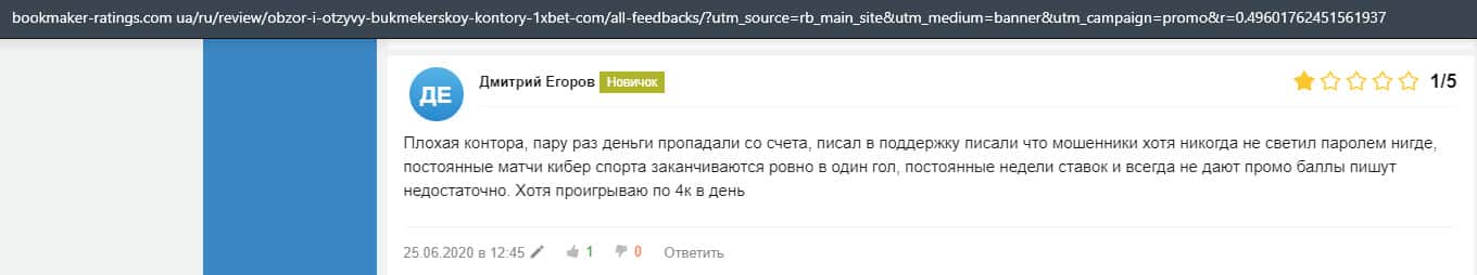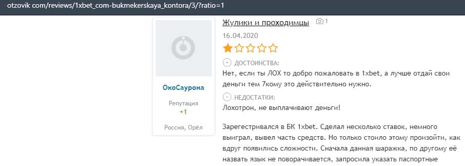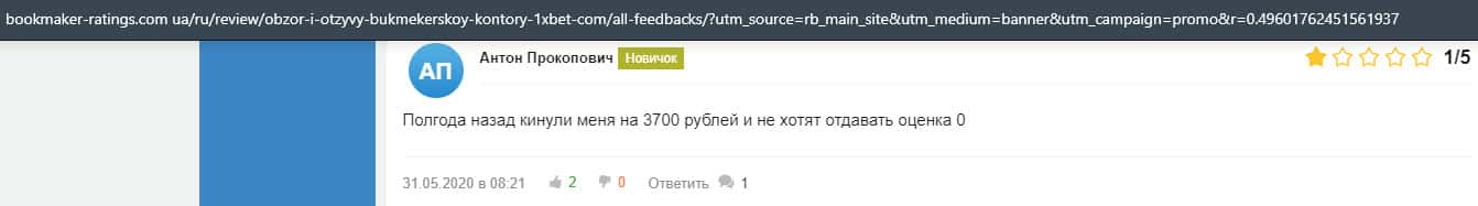 В прошлом году, лохотронская организация 1xBet обворовала человека на 3700 рублей и не захотели даже с ним общаться. Так что он поставил им нулевую оценку.