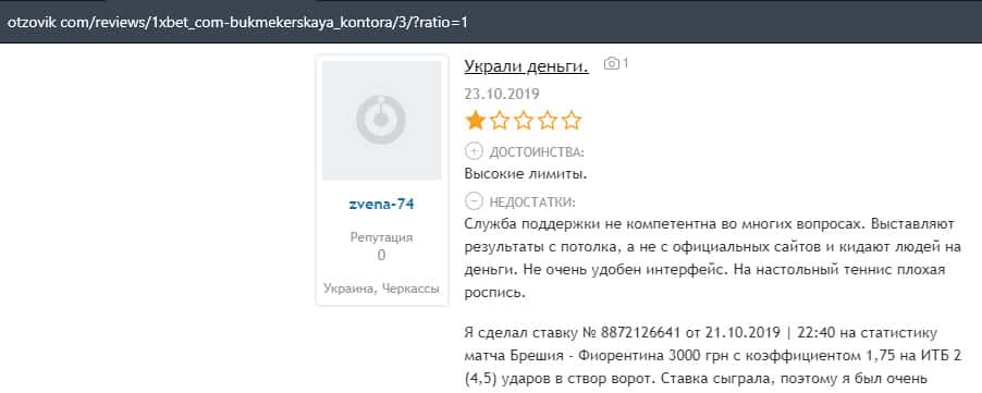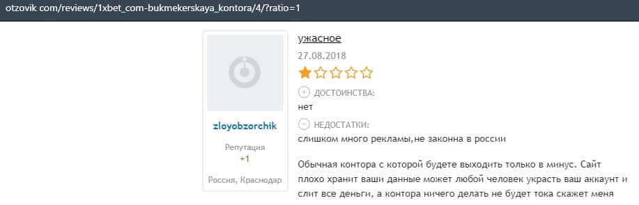 В этом разделе представлена информация в виде жалобы на мошенническую контору 1 Икс Бет, которая обманула клиента на деньги.