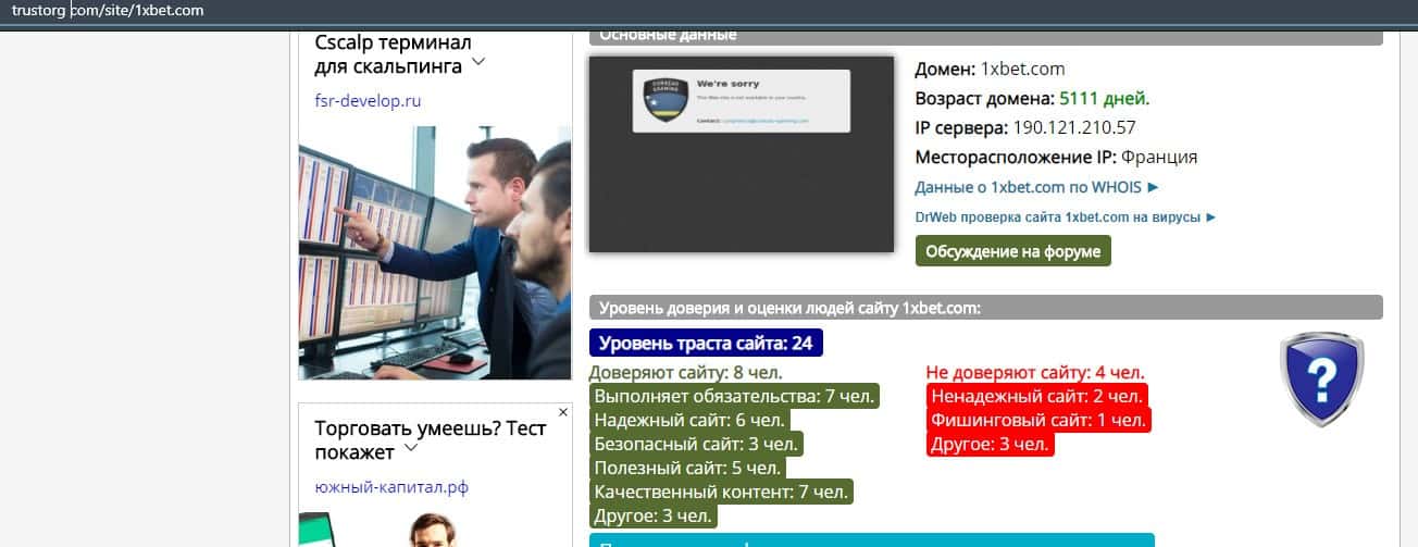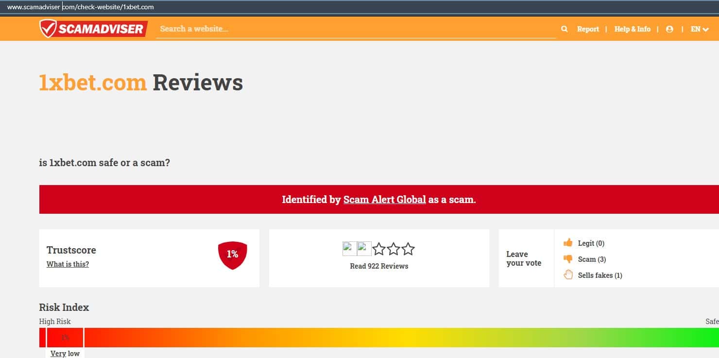 Исходя из тех данных, которые предоставил ресурс скамадвайзер ком, касательно сайта лохотрона 1 Икс Бет, заходить туда крайне опасно, так как он кишит ошибками и вирусами.