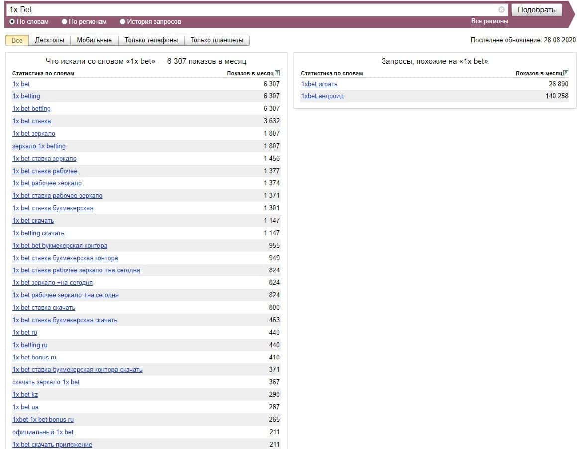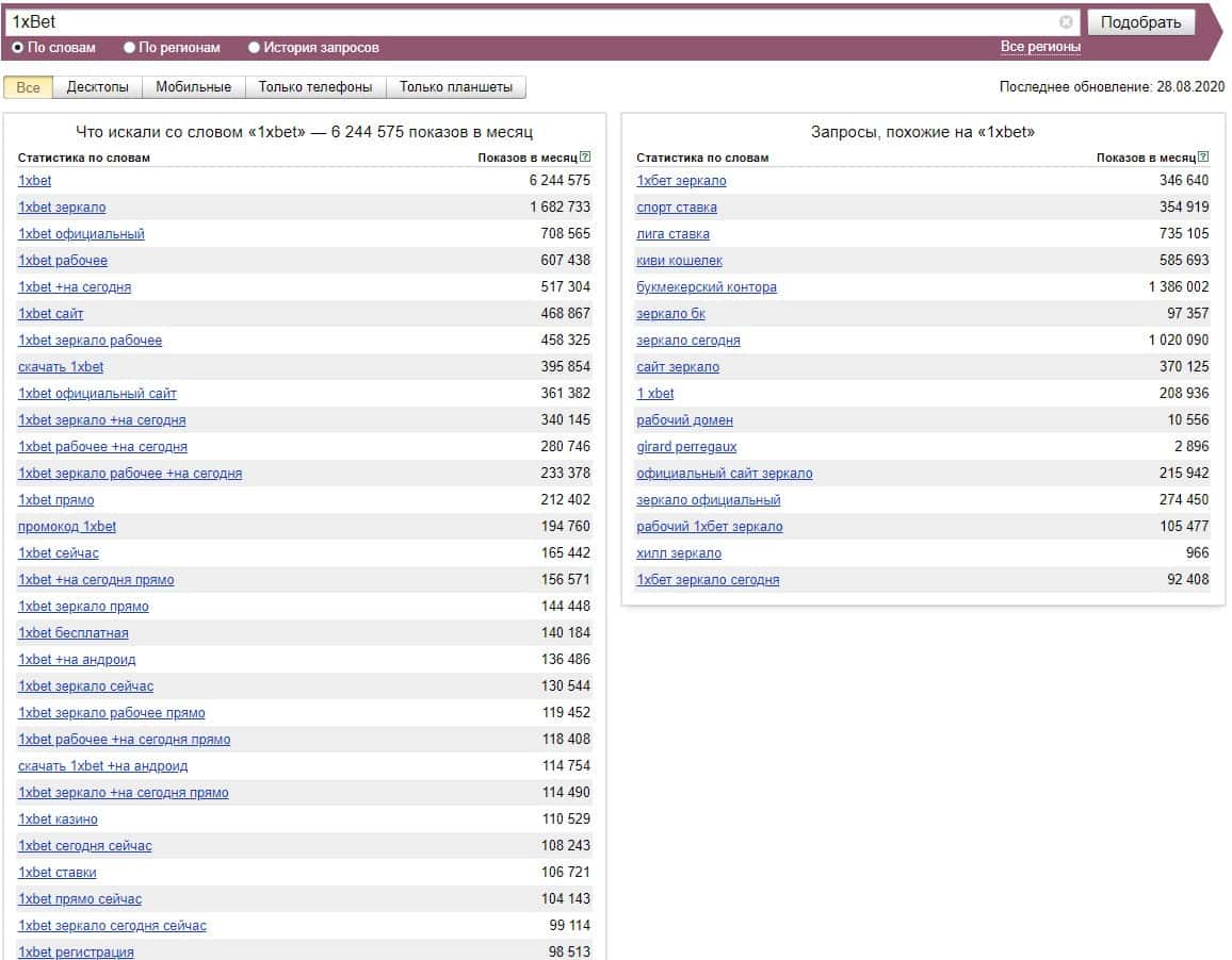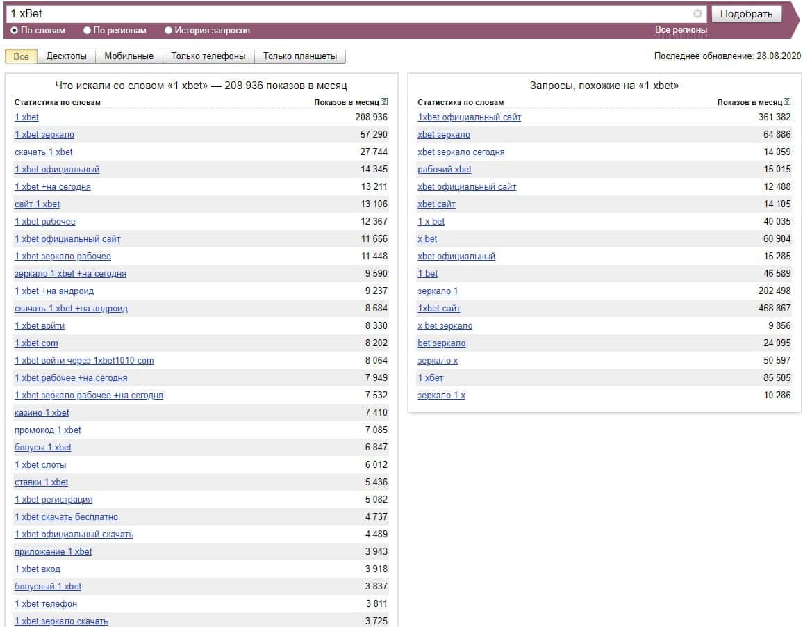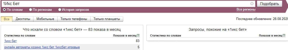 А вот бренд "1 xBet" набрал, по версии Яндекс Вордстат свыше 200 000 показов за последний месяц, что является большим показателем.