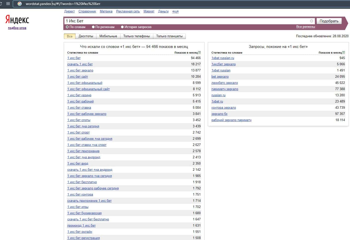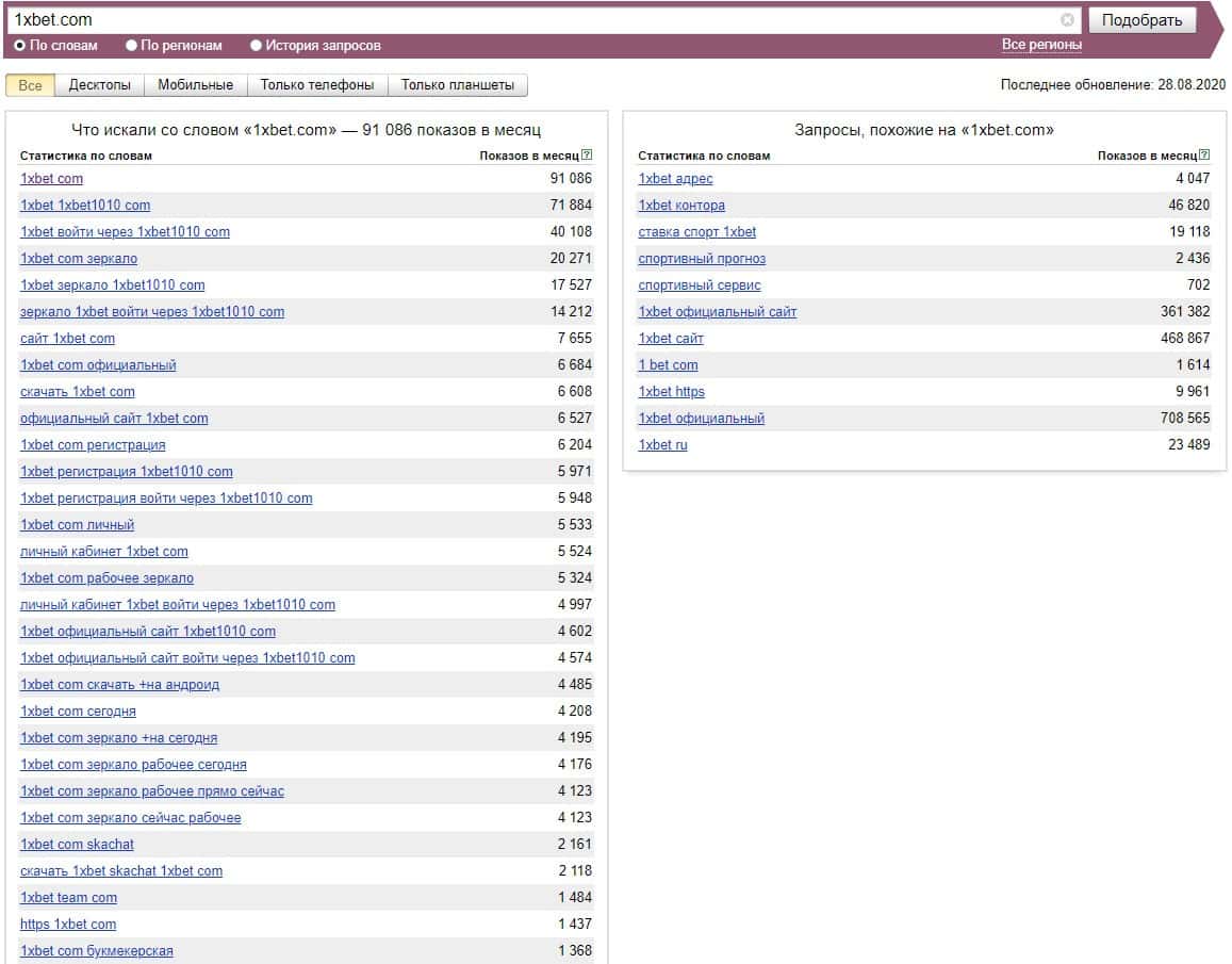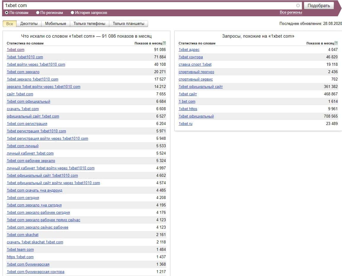 Если ввести в проверку сайт конторы без точки "1xbet com", то система выдает свыше 90 000 показов за последний месяц в поисковой системе Яндекс.