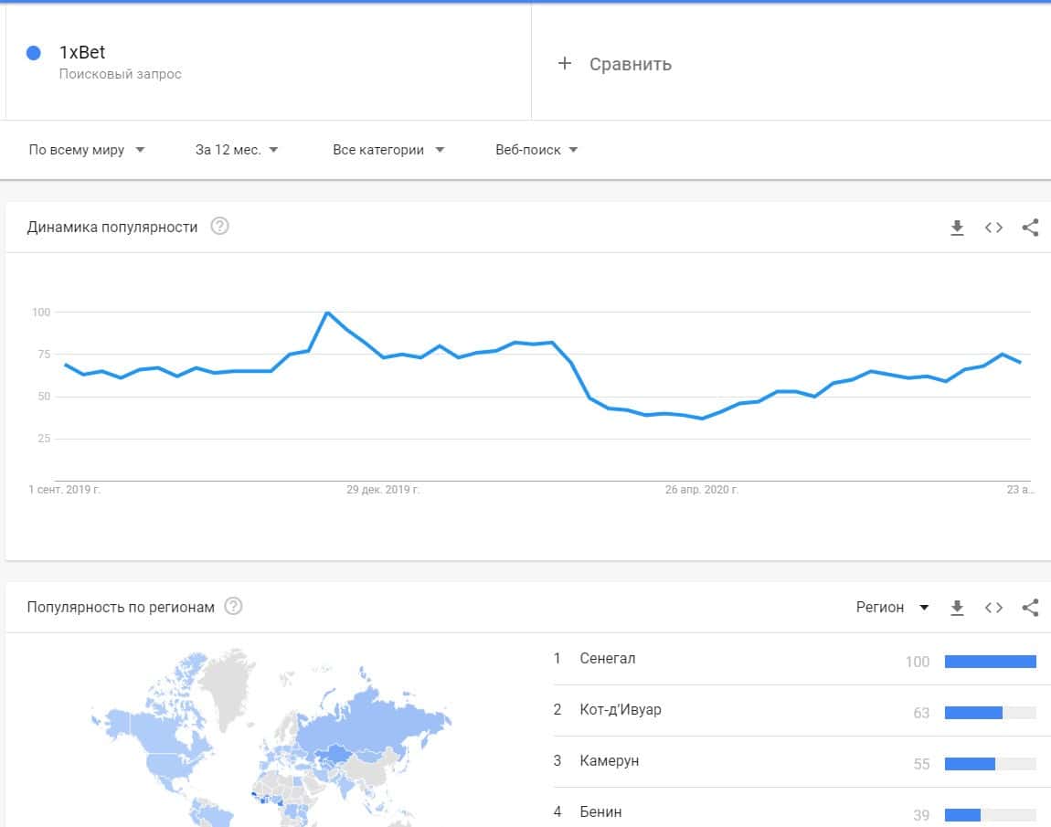 Что касается количества запросов по версии "1xBet", то здесь практически такая же ситуация и запросы в основном поступают из Сенегала, Камеруна, Кот-д'Ивуара и Бенина.