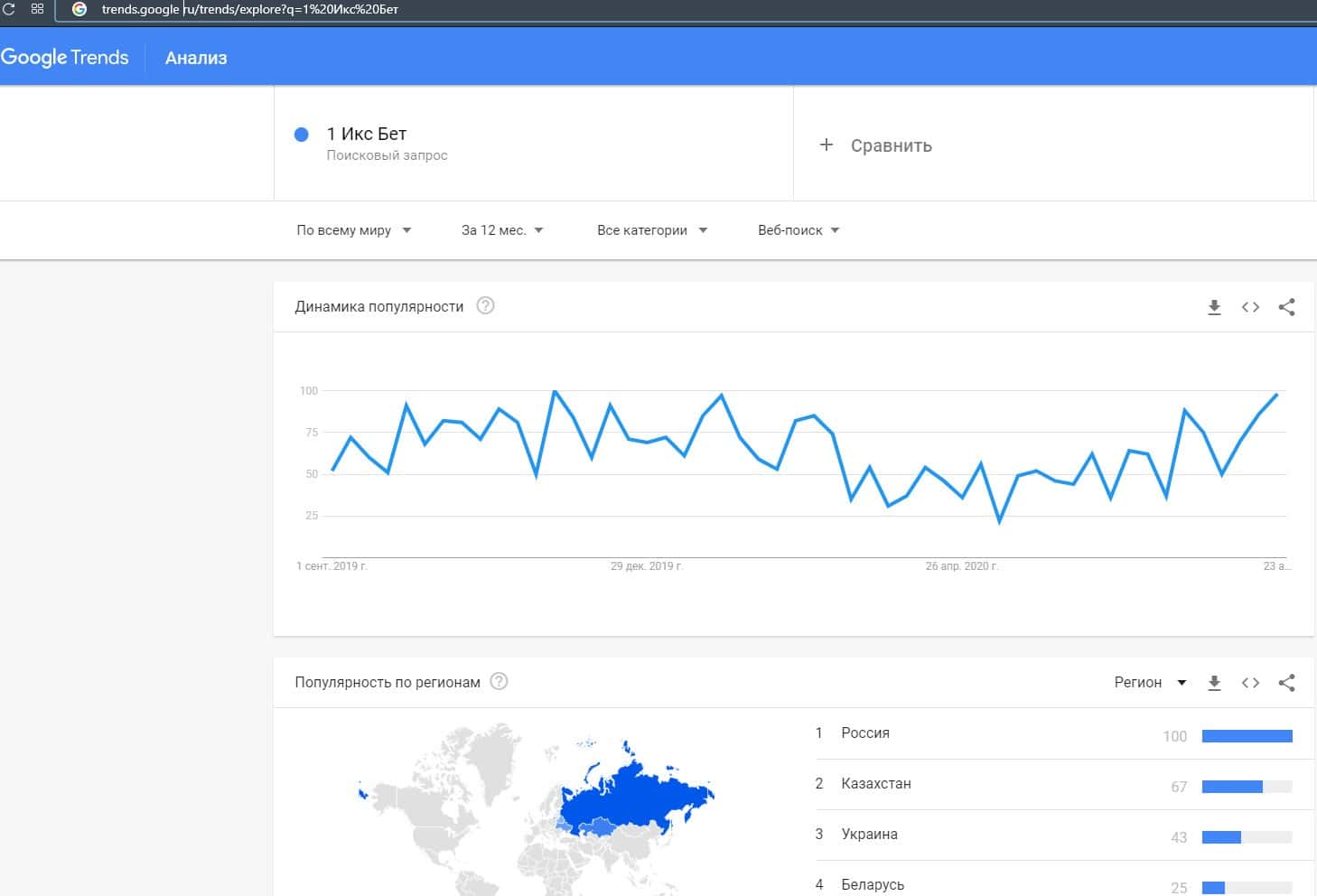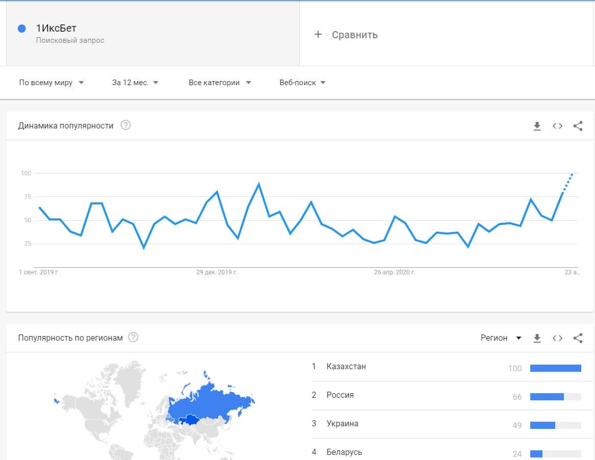 Запросы бренда "1 Икс Бет" очень популярный в поисковой системе Гугл, и все запросы идут в основном из России, Казахстана, Украины и Белоруссии.