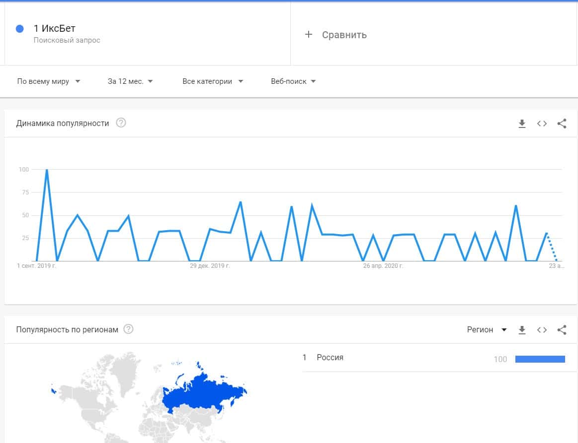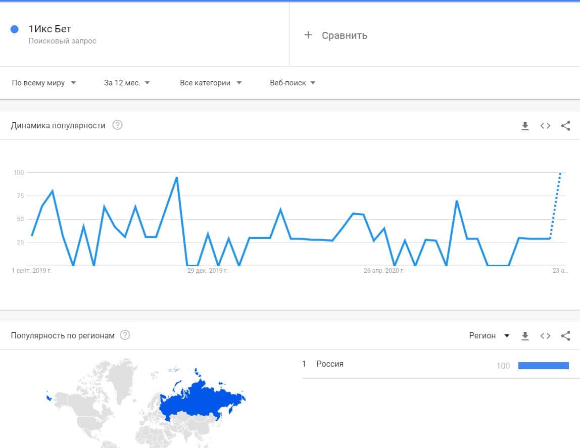 Популярность бренда "1 ИксБет" также была замечена по версии Гугл Трендс, при чем в основном запросы исходят из Российской Федерации.