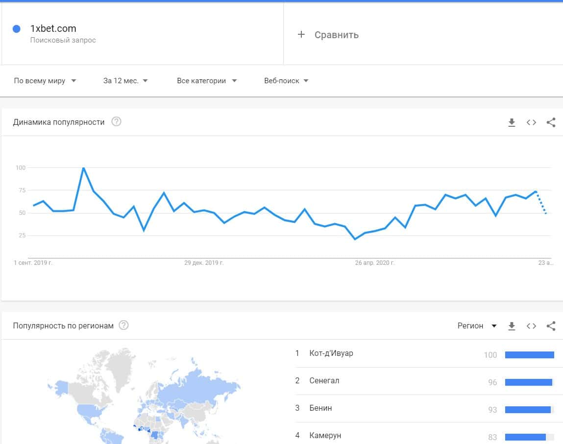 И конечно же добавление точки в бренд "1xbet.com" помог поиске Гугл найти множество показов за последний месяц и в основном они идут из Кот-д'Ивуара, Сенегала и Бенина.