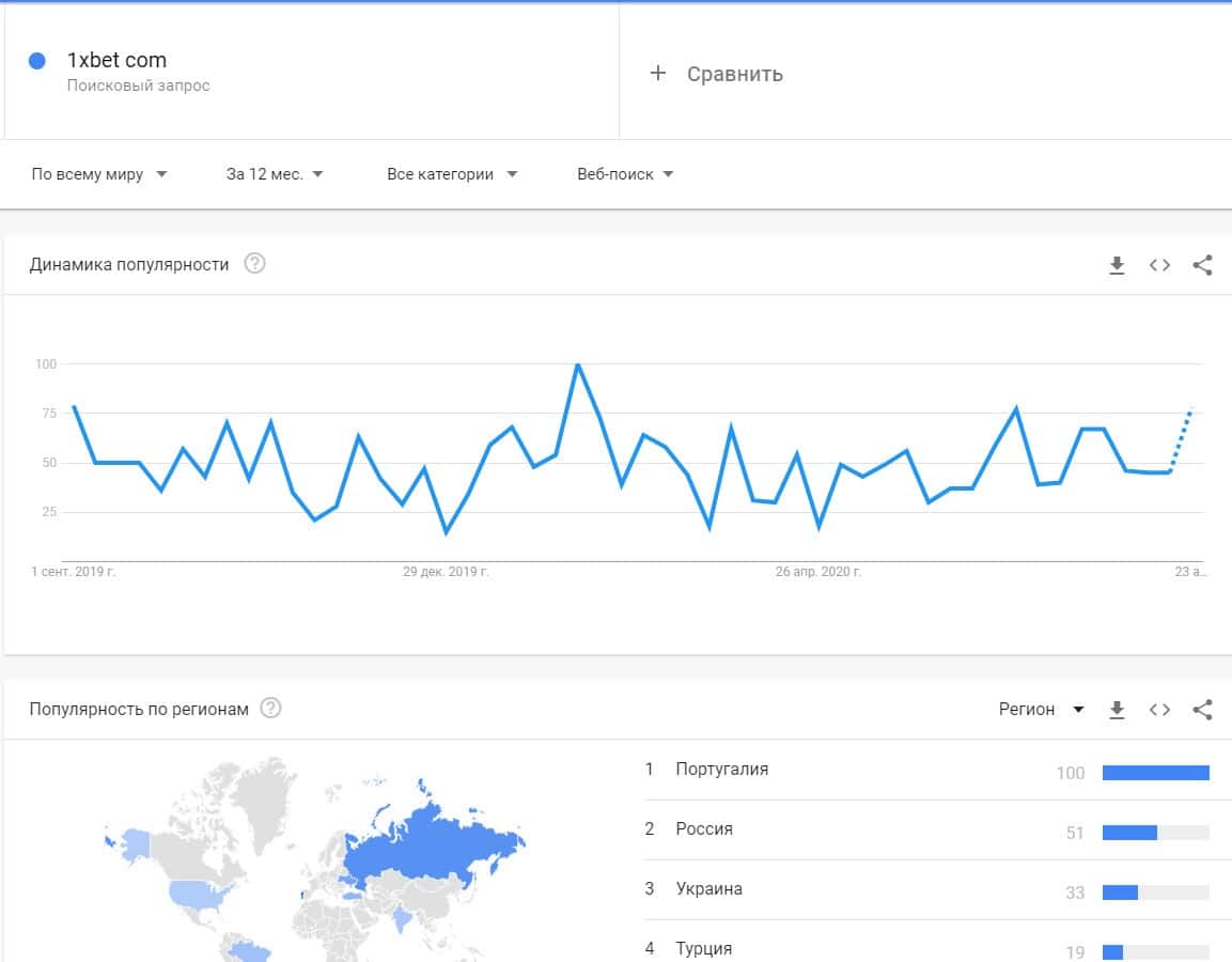 Если ввести бренд в виде официального сайта конторы без точки "1xbet com", то поисковая система Гугл выдает много показов в основном из Португалии, России, Украины и Турции.