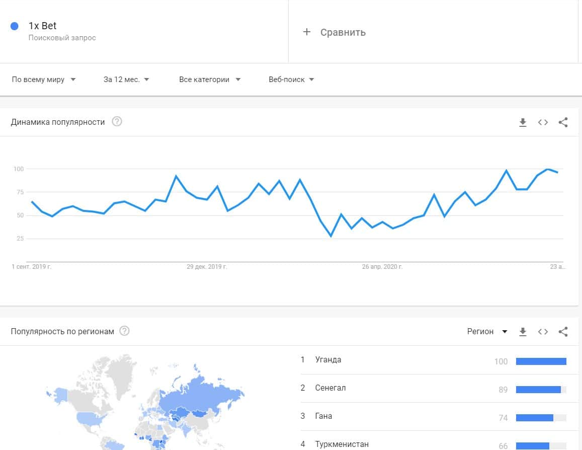 Если рассматривать бренд в такой вариации "1x Bet", то можно прийти к выводу, что лохотронская организация популярна в Уганде, Сенегале, Гане и Туркменистане.