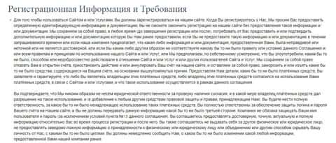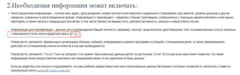 Далее лохотрон 1 Точ Трейд ставит в известность о том, что при регистрации клиент обязан слить мошенникам 1 Touch Trade свою личную и персональную информацию. А учитывая размытость формулировок жуликов 1 Точ Трейд передаваемой информацией могут быть даже номера карт, о чем вы можете прочесть ниже.