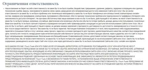 А заканчиваются условия сотрудничества у аферистов 1 Точ Трейд информацией о том, что мошенники 1 Touch Trade вообще отказываются от ответственности за практически весь сайт и непосредственно саму торговую платформу платформу лохотрона 1 Точ Трейд. На изображении ниже вы можете прочесть еще один отказ жуликов 1 Touch Trade.