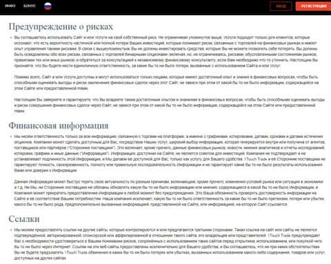 Далее в условиях мошенников 1 Точ Трейд следует информация с отказом аферистов 1 Touch Trade за потери клиентов, связанные с предоставлением жуликами какой-либо торговой информации. Так же под этим предлогом шулера 1 Точ Трейд попросту отказываются от ответственности и от ссылок и других источников, размещенных на сайте.
