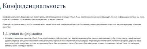 Начинается политика конфиденциальности у аферистов 1 Точ Трейд довольно ожидаемо, а именно с уточнения того, что шулера 1 Touch Trade собирают личную и персональную информацию клиентов. На изображении, расположенном ниже, вы можете увидеть начало политики конфиденциальности аферистов 1 Точ Трейд.