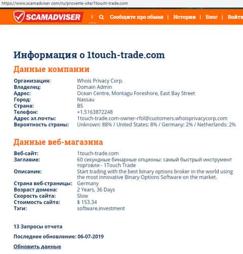 В связи с мошеннической и противозаконной деятельностью руководители лохотрона 1 Точ Трейд предпочитают анонимность дабы избежать ответственности со стороны правоохранительных органов. С этой же целью лохотрон 1 Touch Trade скрывает реальное местоположение сервера своего сайта, о чем можно узнать с помощью портала scamadviser com.