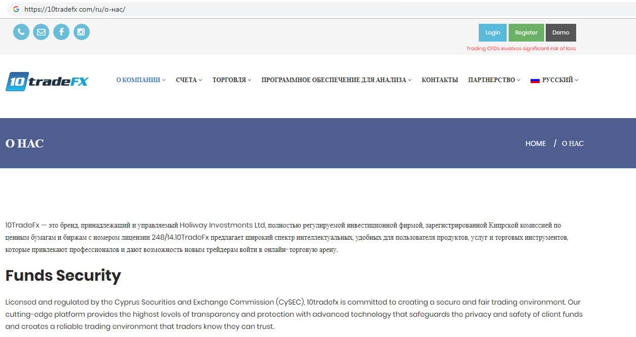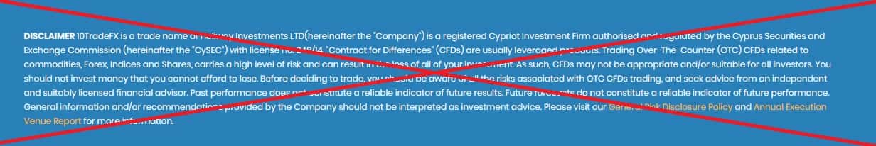 Данная брокерская контора, работающая под брендом 10 Трейд ФХ имеет кипрскую прописку, что делает ее незаконной работающей организацией на территории Российской Федерации. 10TradeFx не имеет лицензий от регуляторов финансового рынка в РФ.