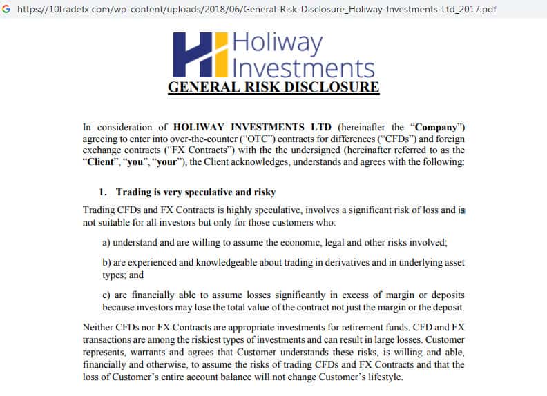 - Уведомление о рисках брокерской конторы 10 Trade FX