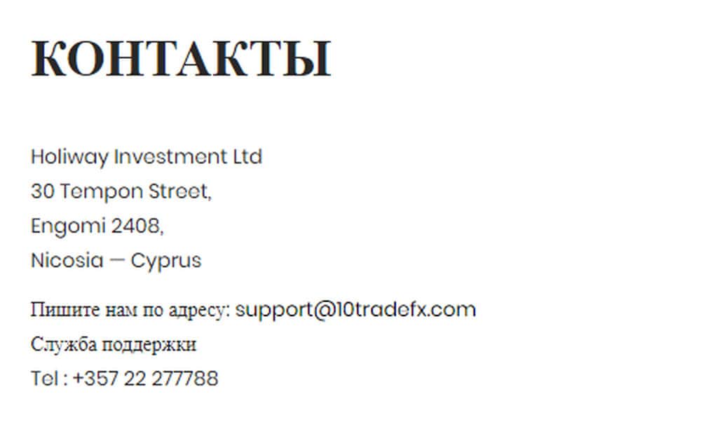 Мошенники 10 Трейд ФХ оставили некоторые контактные данные о своем местоположении. Главный офис брокерской организации находится на Кипре. А так же они предоставили свою электронную почту и номер телефона: