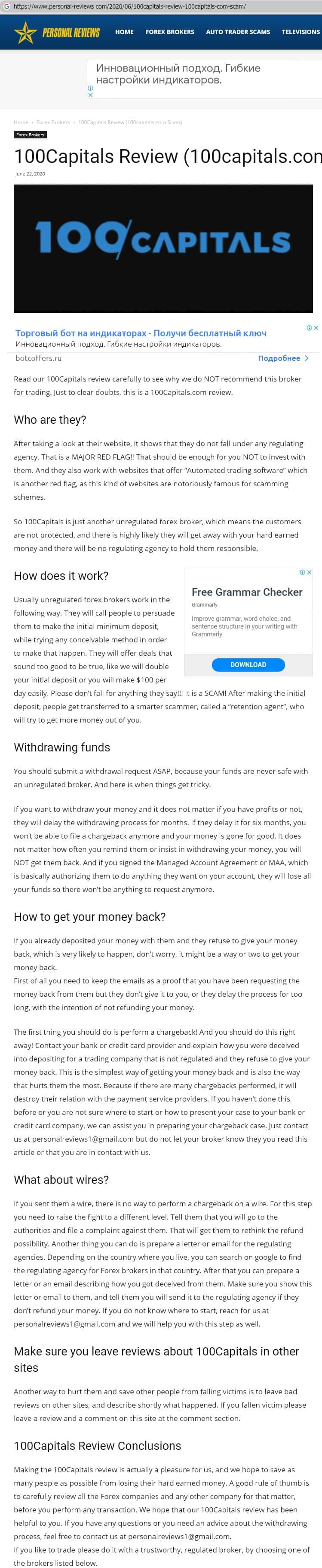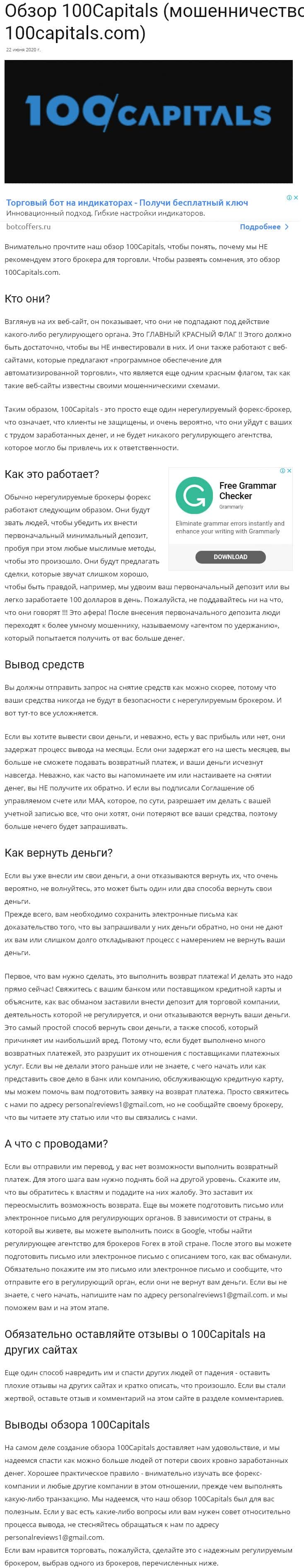 В статье, опубликованной в июне 2020 года на портале personal-reviews com, пользователя, ищущего возможности легких заработков посредством трейдинга в Интернет, предупреждают о неблагонадежности проекта 100Капиталс.