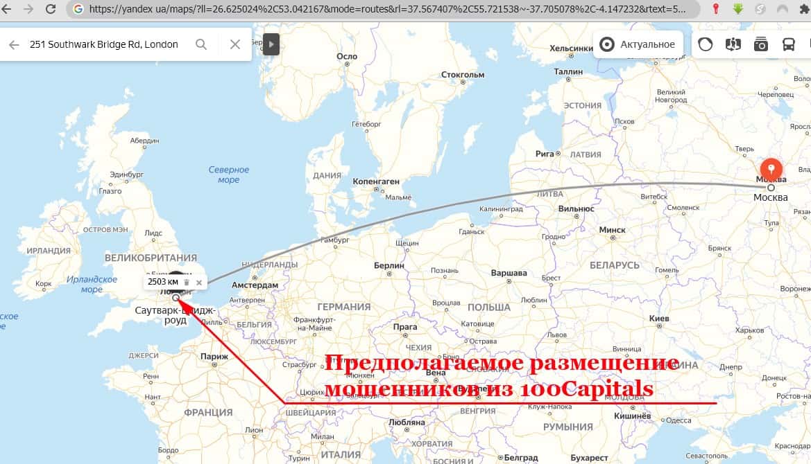 По неоднократно упоминаемым сведениям на портале мошенников 100capitals com эту жульническую контору юридически представляет компания с таким же именем 100 Capitals, зарегистрированная по адресу: 251 Southwark Bridge Rd, London.