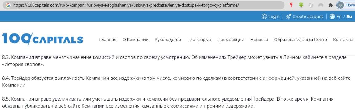 Согласно п. 8.3 и п. 8.5 жулики из 100Капиталс могут по своему усмотрению изменять любые условия торговли, не задумываясь о последствиях для трейдеров и их уведомлении о вступивших в силу изменениях условий торговли.
