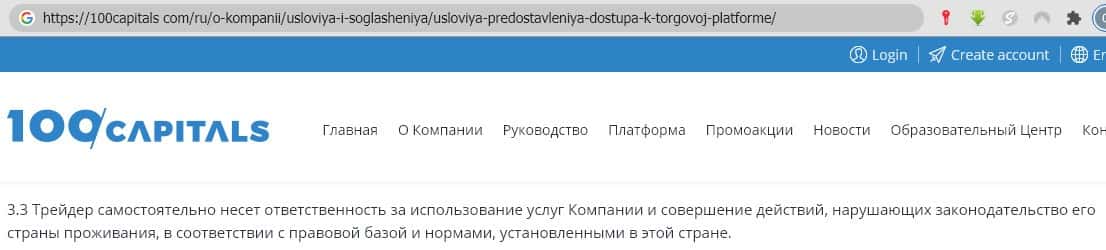 Незаконно предлагая свои услуги (не имея ни разрешений ни лицензий на брокерскую деятельность), аферисты из 100Капиталс в п.3.3 возлагают всю юридическую ответственность за сотрудничество с ними исключительно на своих клиентов.