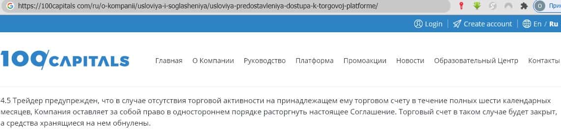 По прошествии полугода без торговой активности клиента, аферисты из 100Капиталс закрывают аккаунт клиента, а все средства, находящиеся на его торговом счету изымаются в пользу компании без предупреждения (п. 4.5).