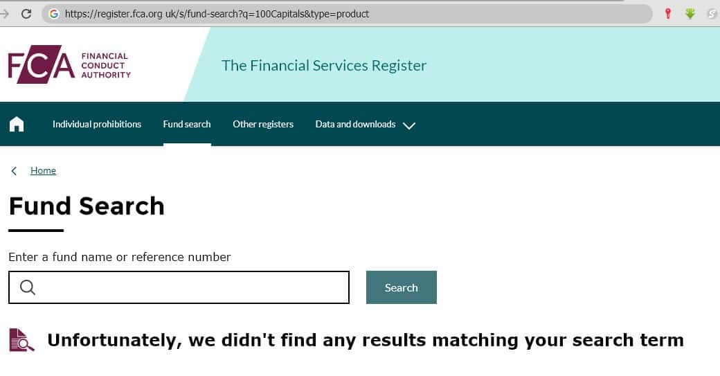 В своей рекламе жулики из 100Капиталс упоминают о себе, как о регулируемом брокере. Исходя из опубликованного Лондонского адреса, напрашивается вывод о регулировании деятельности этого брокера английской FCA. Но в этом уважаемом заведении о брокерской компании 100Capitals не слышали.