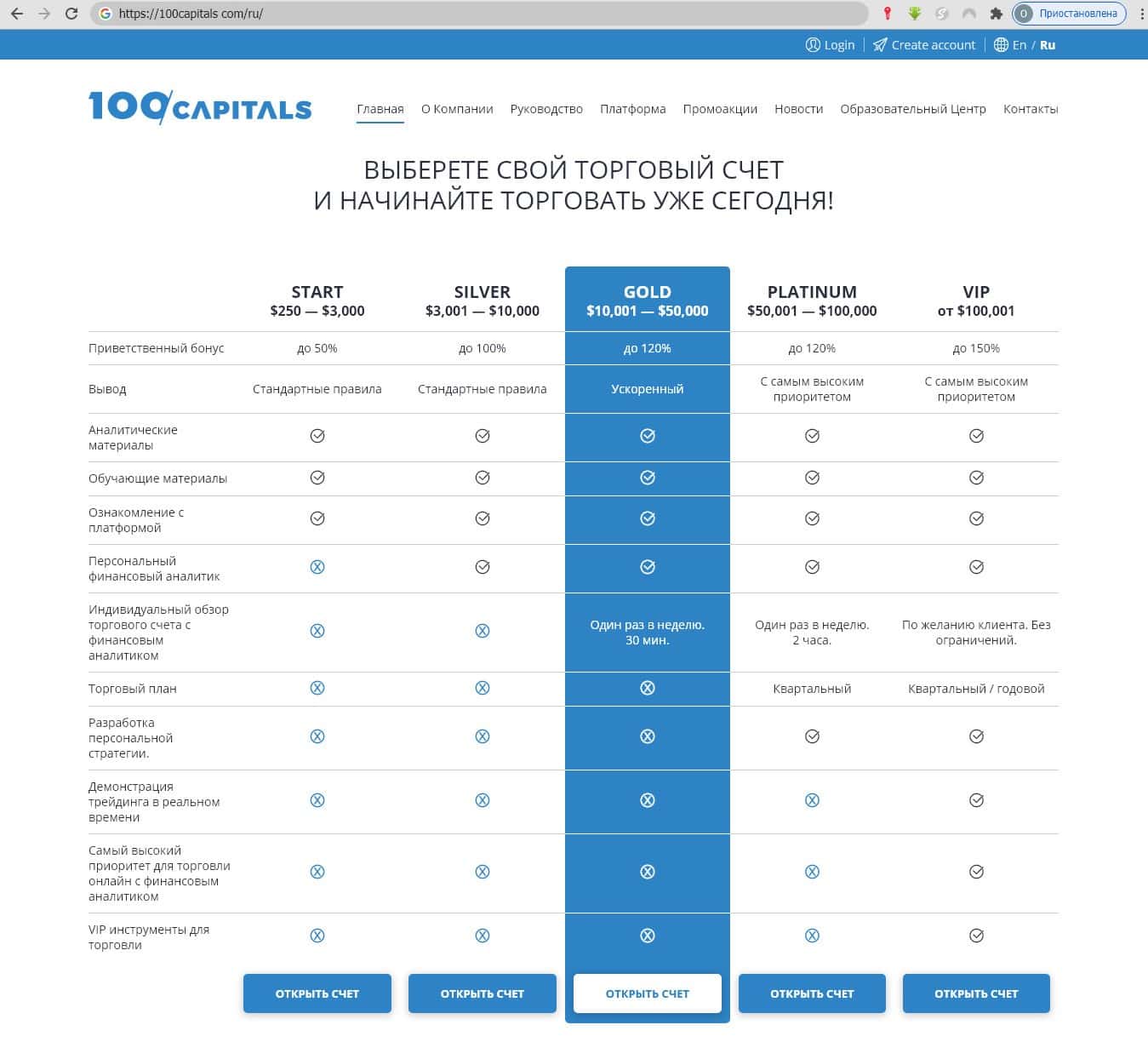Аферисты из 100Капиталс предлагают своим трейдерам на выбор целых пять типов аккаунтов. Их условия находится за гранью понимания и возможностями рядовых трейдеров, имея начальный депозит в 100 тысяч долларов США и практически те же условия, что и счет с 250-ю долларами.