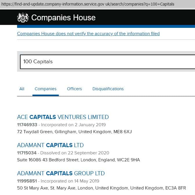 Отсутствие лицензии FCA понятно. Основываясь на том же Лондонском адресе, мы попытались найти компанию 100Capitals в реестре компаний Великобритании. Где нас ждал закономерный факт липового существования данного торгово-финансового учреждения.