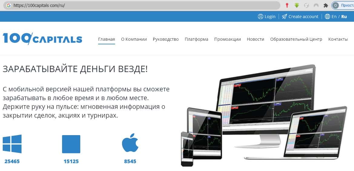До открытия аккаунта на торговой площадке 100Капиталс о используемой торговой платформе практически ничего не известно, лишь что существуют варианты как для персонального компьютера, так и для мобильных платформ на базе iOs, Android.