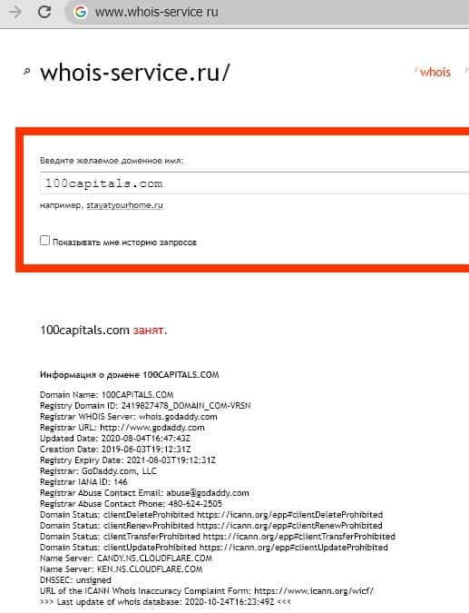 Не афишируя никаких своих данных, мошенники не стали раскрывать себя и при регистрации своего домена: данные о компании-владельце домена 100capitals com скрыты правообладателем.