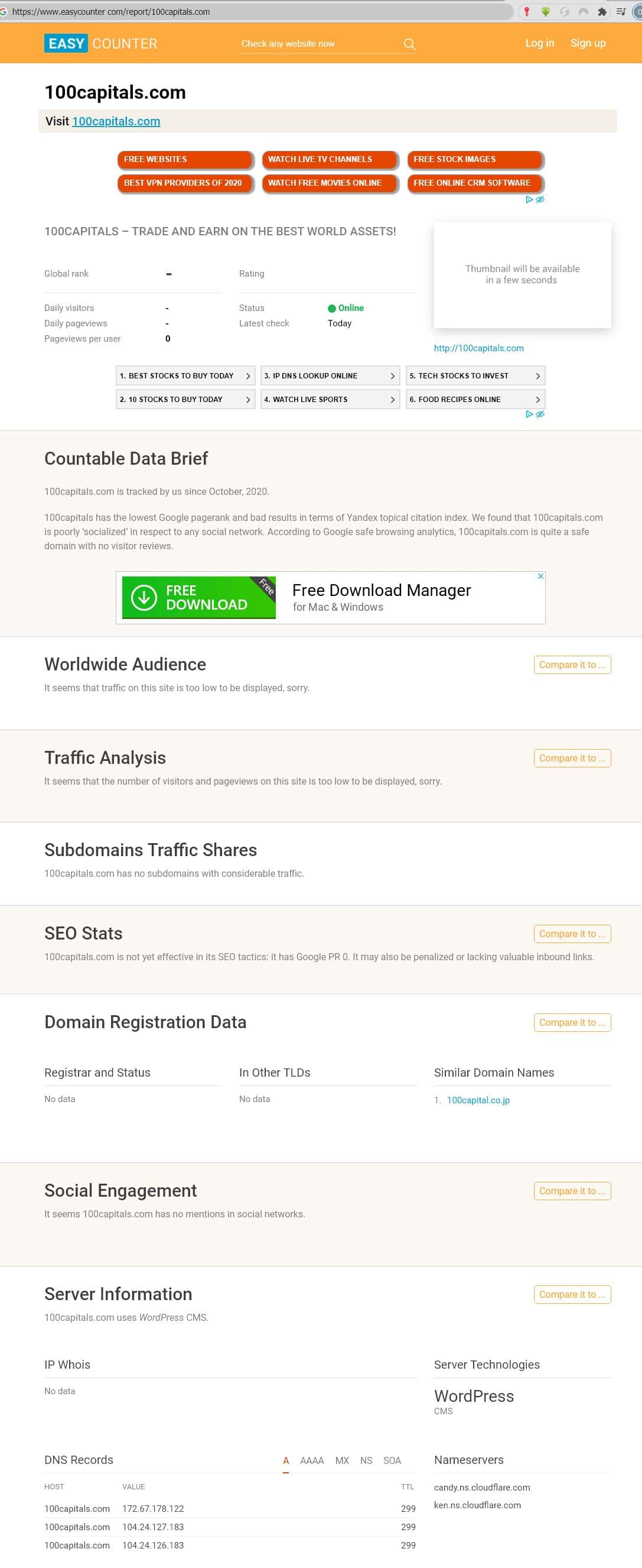 Трафик сайта аферистов из 100Капиталс незначительно мал. На основе такого трафика сервисы портала easycounter com не в состоянии корректно его проанализировать и сделать выводы.