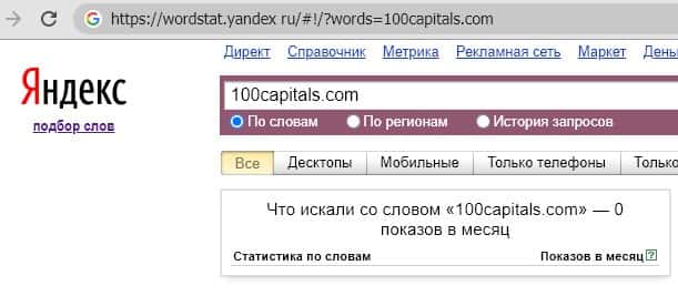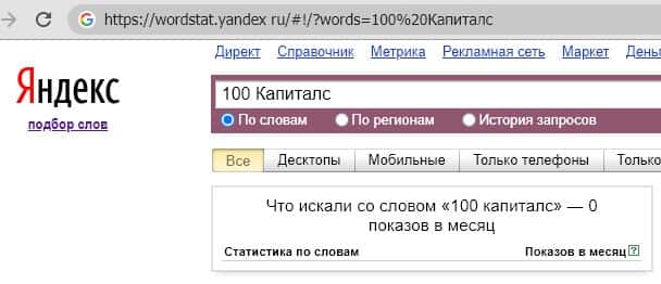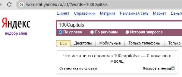 В поисковой системе Яндекса также нулевые значения и английского варианта бренда брокерской конторы "100Capitals".