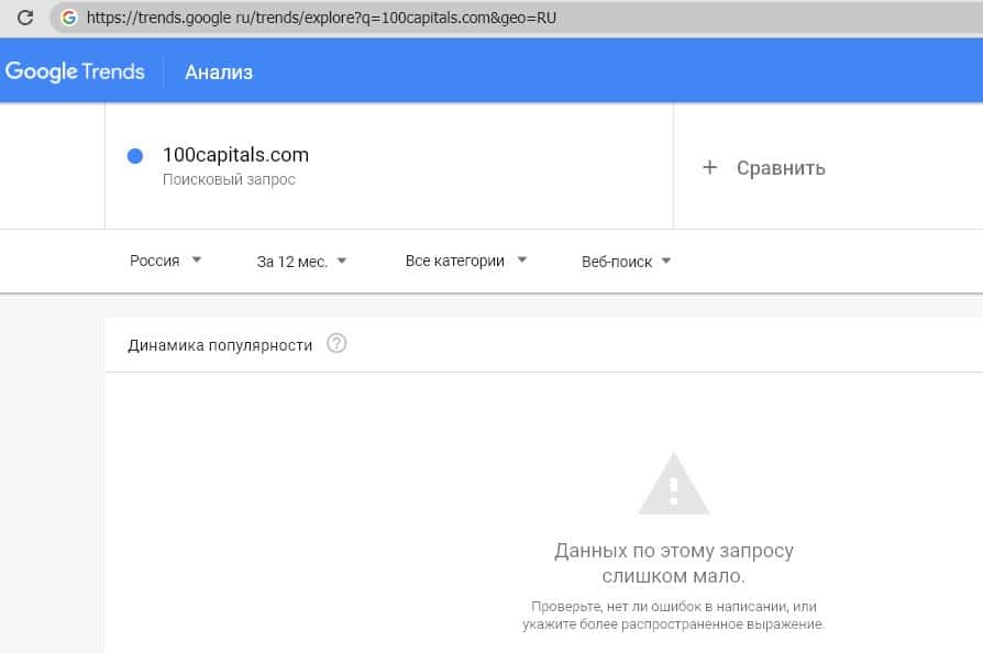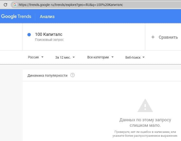 Отсутствует и активность пользователей по поиску портала "100capitals.com" на поисковом сервере Google. Меньше наивных пользователей попадаться в сети этих мошенников.