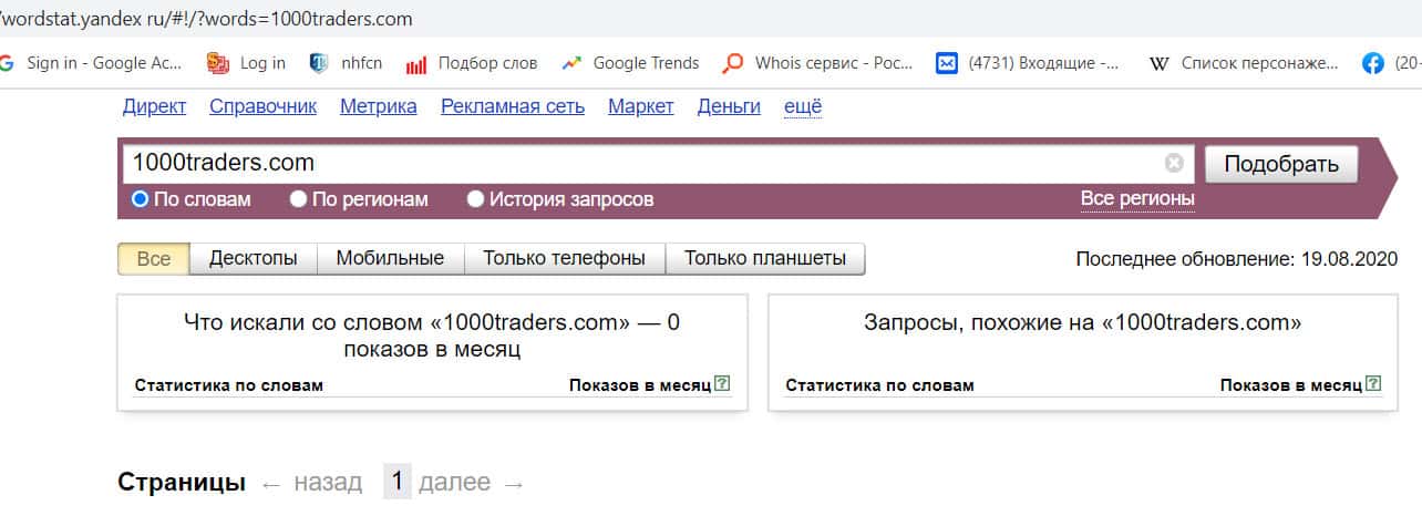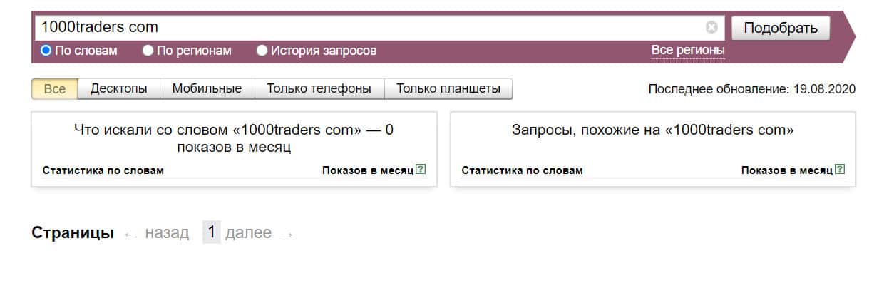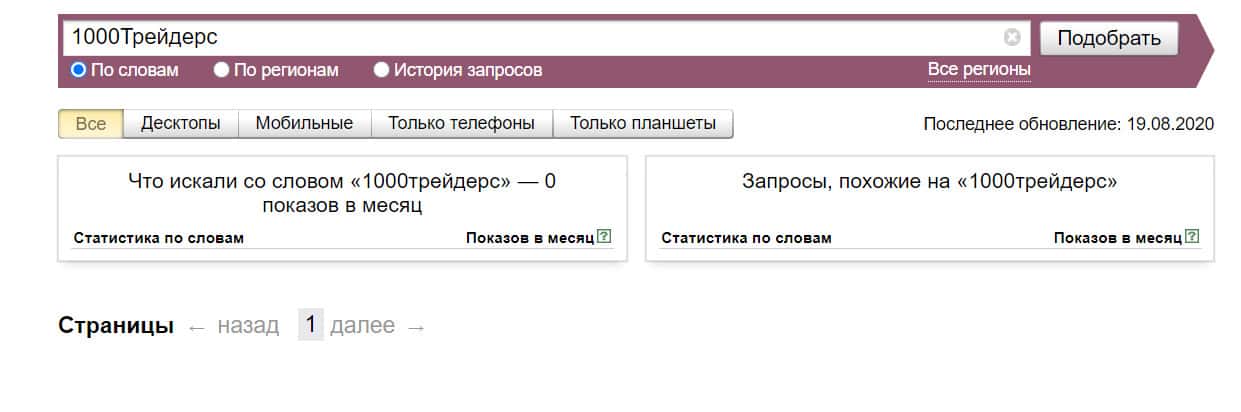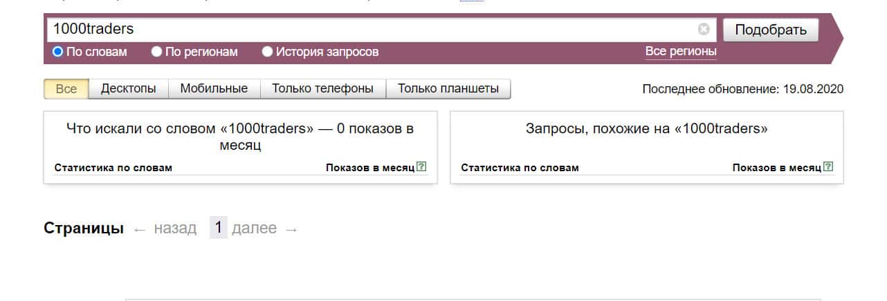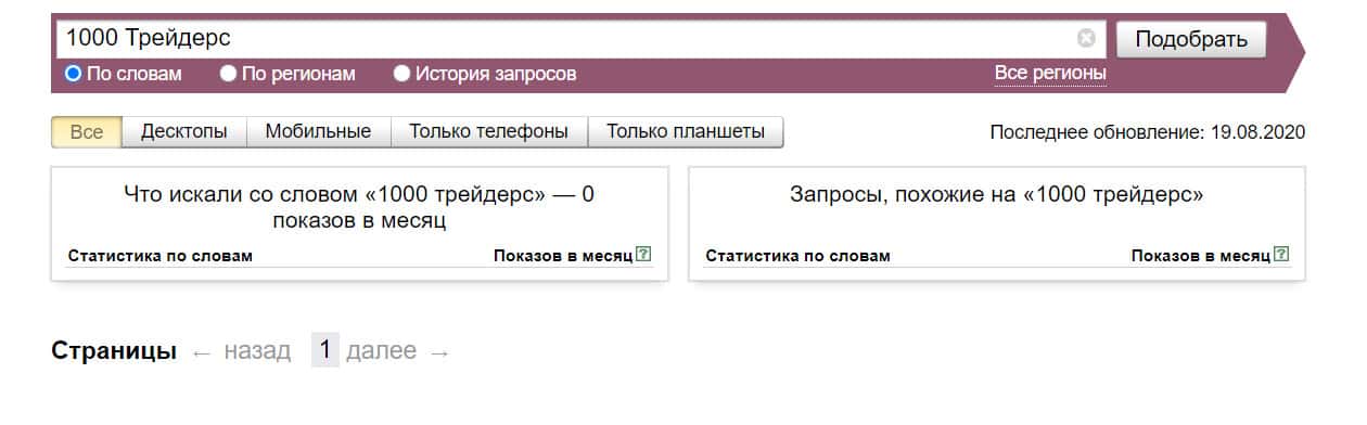 Посмотрим, сколько раз люди искали название бренда "1000 Трейдерс" на русском языке с пробелом: результат 0 показов.