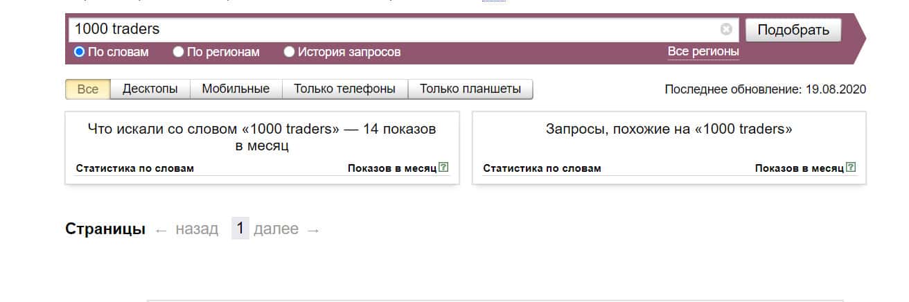 Посмотрим, сколько раз люди искали название бренда "1000 Трейдерс" на русском языке с пробелом. Незначительное количество раз.