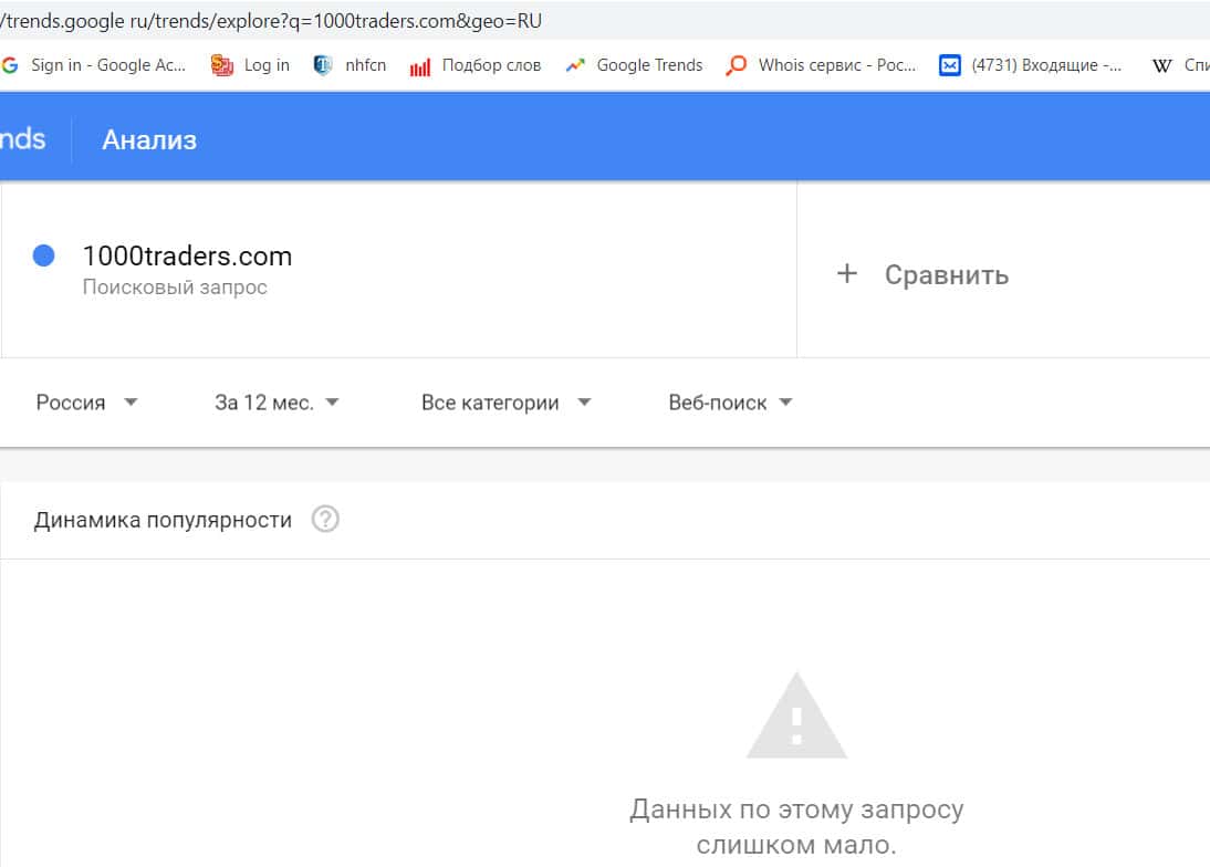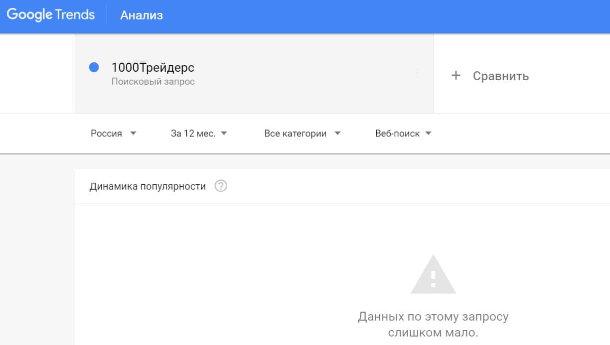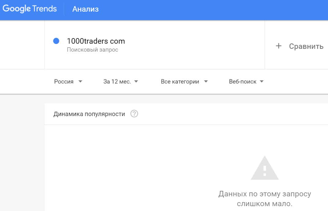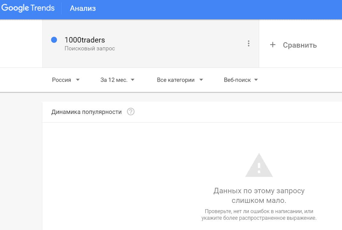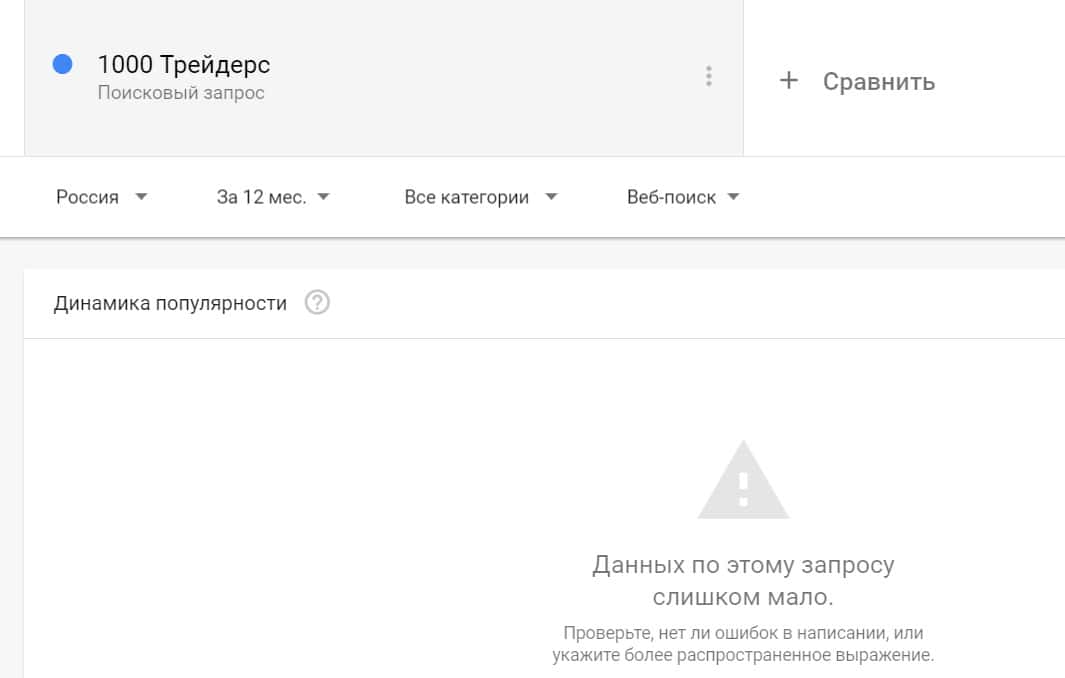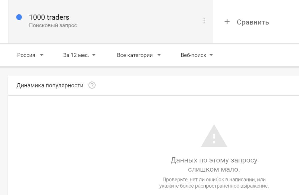 Посмотрим, насколько популярно название бренда "1000traders", написанное на английском языке. Данных по этому запросу нет, так как никто не искал этот бренд в Гугл.