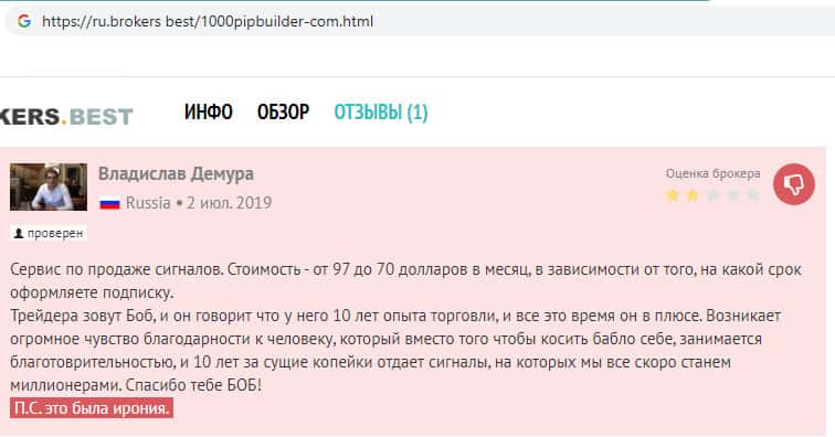 - Ироничный отзыв от клиента компании разводил 1000PipBuilder Com