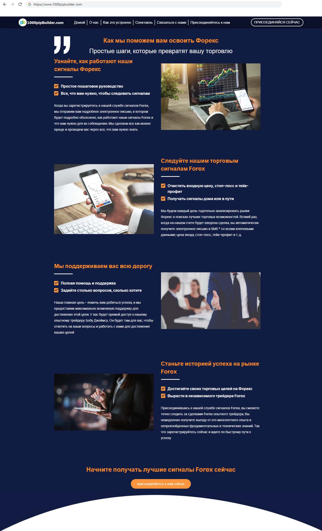 Лохотронщико 1000PipBuilder Com на своём сайте рассказали о том, как они якобы могут помочь заработать деньги на рынке форекс. Они утверждают, что нужно следовать сигналам от компании, которые приходят постоянно, и ещё компания будет поддерживать каждого клиента. Так же фирма утверждает, что пользователи могут стать историей успеха на рынке форекс.