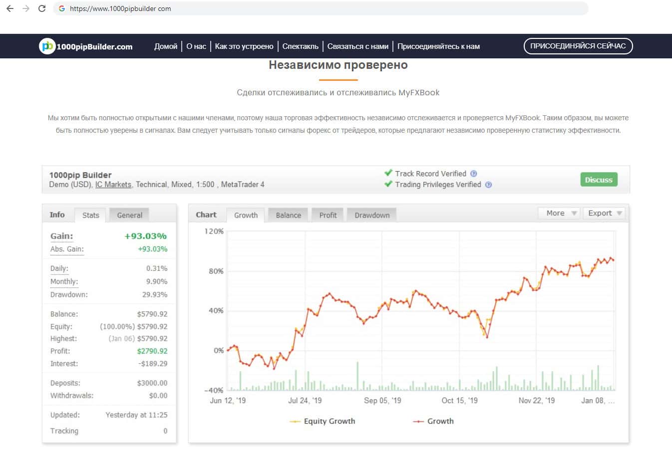 Мошенники 1000PipBuilder Com пытаясь завоевать доверие клиентов идут на все уловки и мастерски врут пользователям, а главное очень убедительно. Компания утверждает, что хочет быть очень открытой с клиентами, по этому торговая эффективность независимо отслеживается и проверяется MyFXBook, и из за этого пользователь почему то должен быть уверен в сигналах.