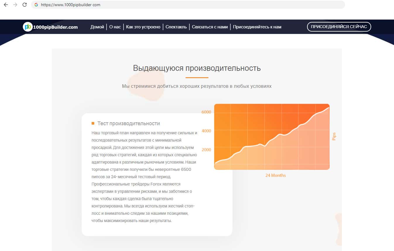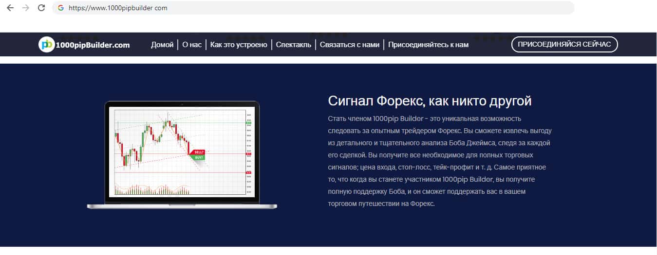 Главный интернет ресурс компании лохотронщиков 1000PipBuilder Com представляет собой простой коммерческий проект, который создан только с целью обмануть пользователей. Вся информация на сайте никак не подтверждена и сайт наполнен просто громкими фразами от аферистов. К сожалению многие ведутся на яркую упаковку сайта и лживые фразы жуликов.