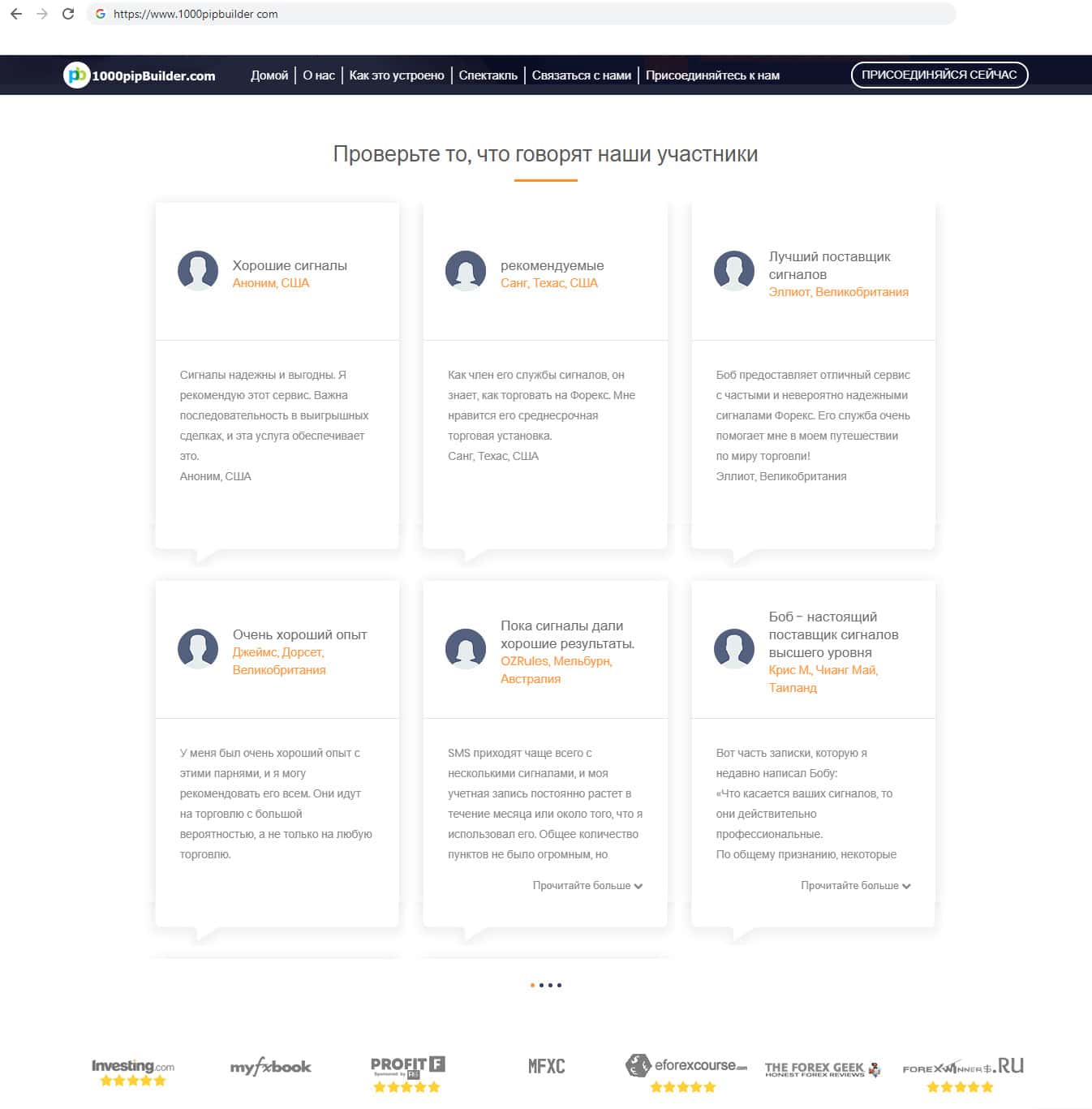 Компания и на своём сайте не забывает публиковать фальшивые отзывы. Этому жулики 1000PipBuilder Com посвятили целый раздел сайта, где опубликовала якобы отзывы клиентов, и конечно же они все положительные, настоящие отзывы фирма никогда не опубликует, так как пользователи поймут, что компания просто зарабатывает и не более.